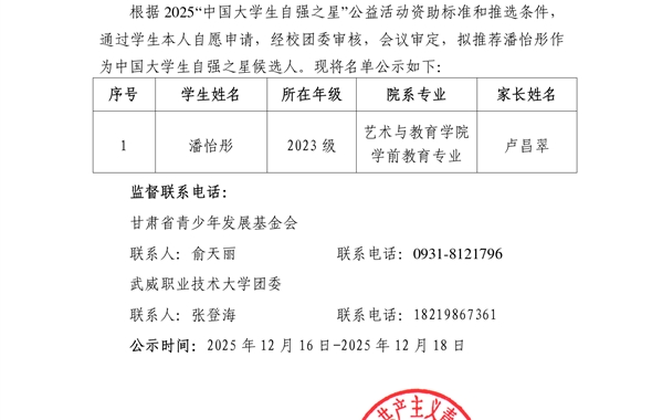 擬推薦潘怡彤為“中國(guó)大學(xué)生自強(qiáng)之星”候選人的公示