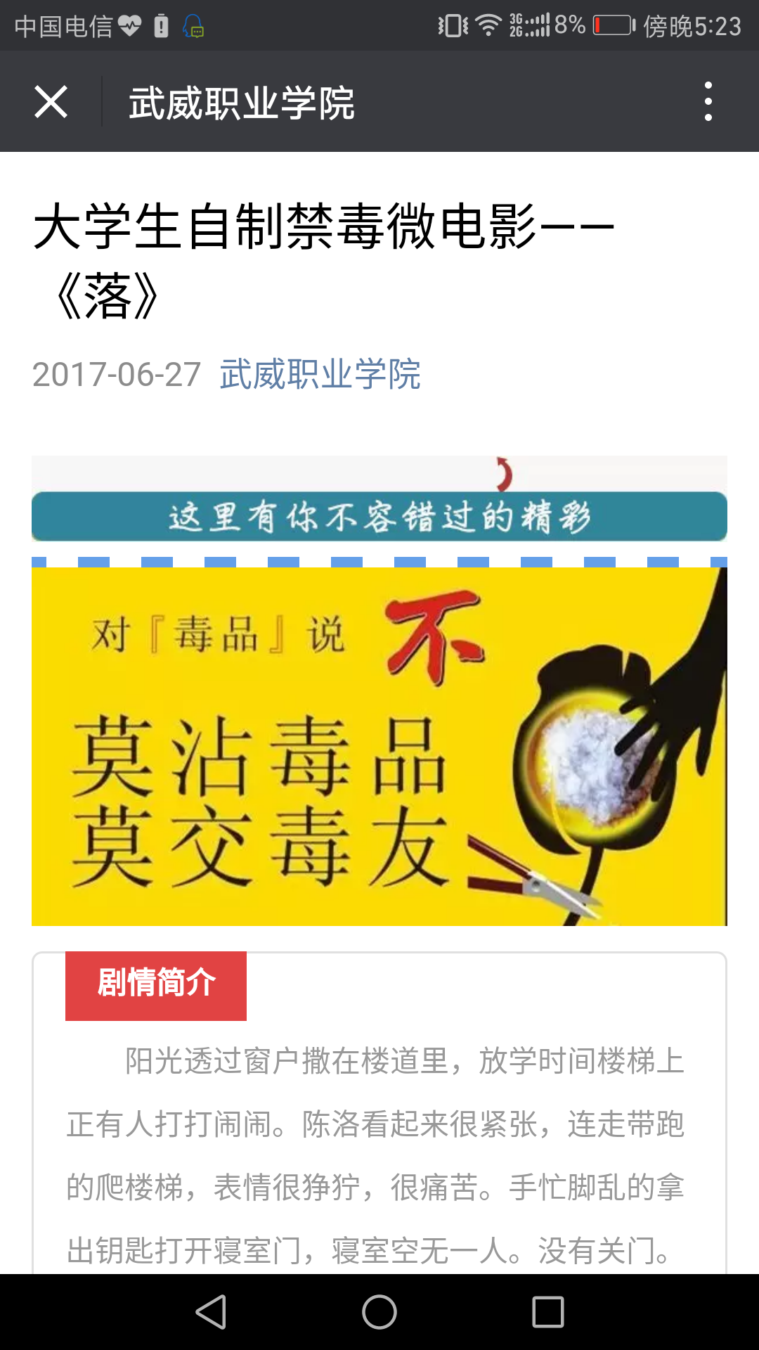 為進(jìn)一步推進(jìn)平安校園建設(shè),不斷推進(jìn)青少年毒品預(yù)防教育“6·27”工程活動(dòng)的深入開展,增強(qiáng)師生的禁毒意識(shí),武威職業(yè)學(xué)院根據(jù)甘肅省禁毒委員會(huì)辦公室、甘肅省教育廳《關(guān)于做好2017年秋季開學(xué)在校學(xué)生毒品預(yù)防教育工作的通知》要求,在全院范圍內(nèi)開展了禁毒宣傳教育“五個(gè)一”活動(dòng)。