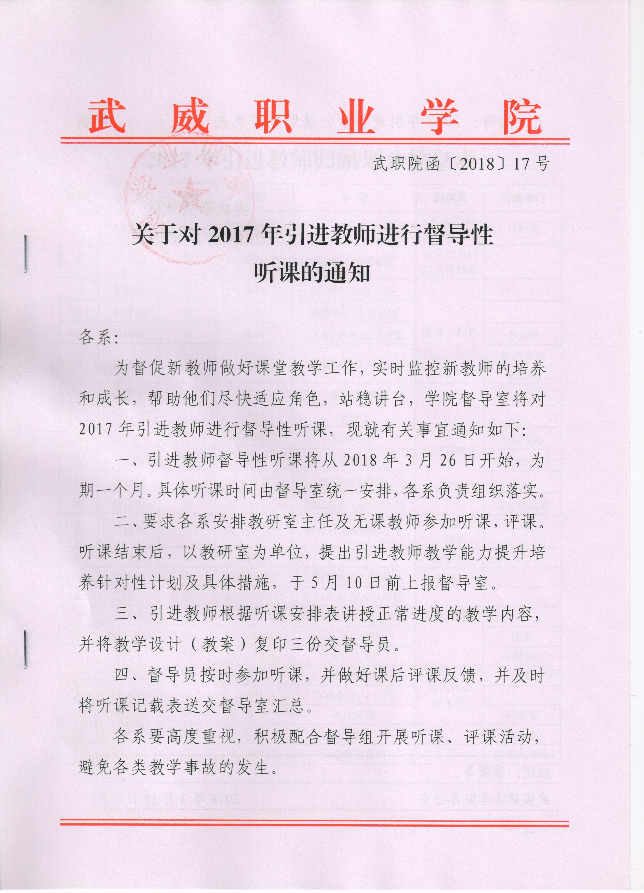 關(guān)于對(duì)2017年引進(jìn)教師進(jìn)行督導(dǎo)性聽課的通知