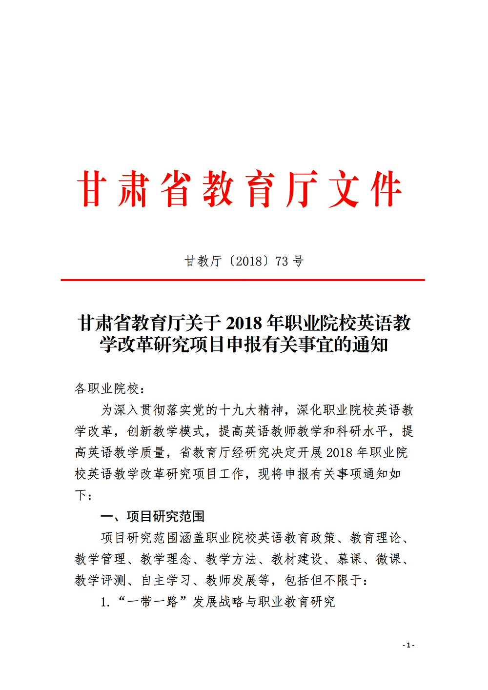 轉(zhuǎn)發(fā)甘肅省教育廳關于申報2018年職業(yè)院校英語教學改革研究項目的通知