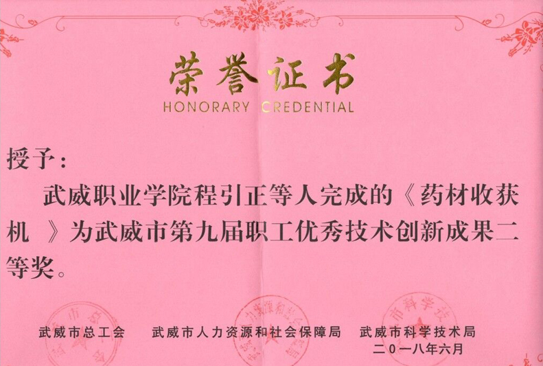 近日,武威市總工會、武威市人力資源和社會保障局、武威市科學技術局在全市企事業(yè)單位和廣大職工中廣泛開展了征集評選職工優(yōu)秀技術創(chuàng)新成果活動。經(jīng)過逐級推薦、專家評審、網(wǎng)絡公示等程序,我系教師程引正等完成的《藥材收獲機》喜獲武威市第九屆職工優(yōu)秀技術創(chuàng)新成果二等獎。
