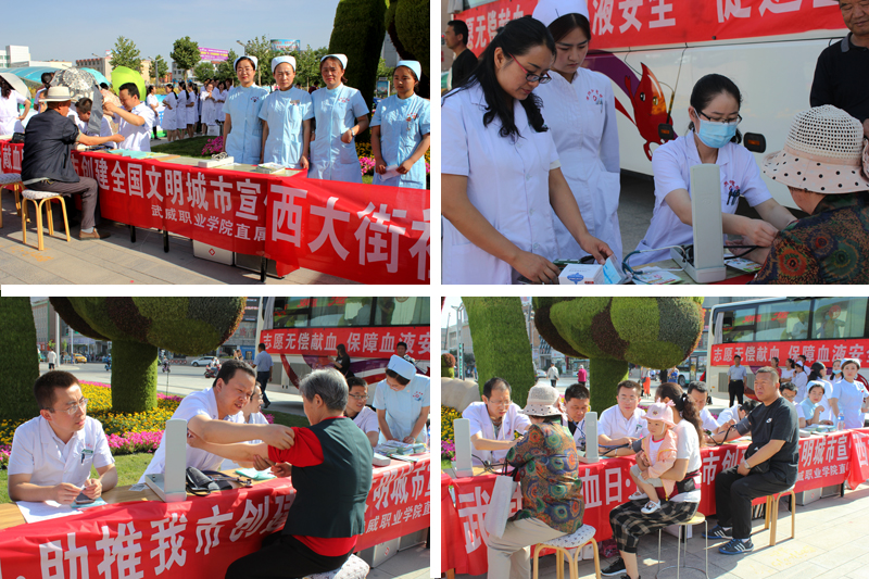 為保障臨床用血安全,給我市創(chuàng)建全國文明城市活動增亮添彩,由武威市衛(wèi)生計生委、武威市紅十字會主辦,武威市中心血站承辦的“世界無償獻(xiàn)血者日”大型宣傳、義診、獻(xiàn)血活動于6月14日在武威市文化廣場隆重舉行。學(xué)院附屬醫(yī)院醫(yī)護(hù)人員、學(xué)院紅十字志愿者方隊、無償獻(xiàn)血獲獎?wù)叻疥牭?0余家單位的干部群眾參加了活動。