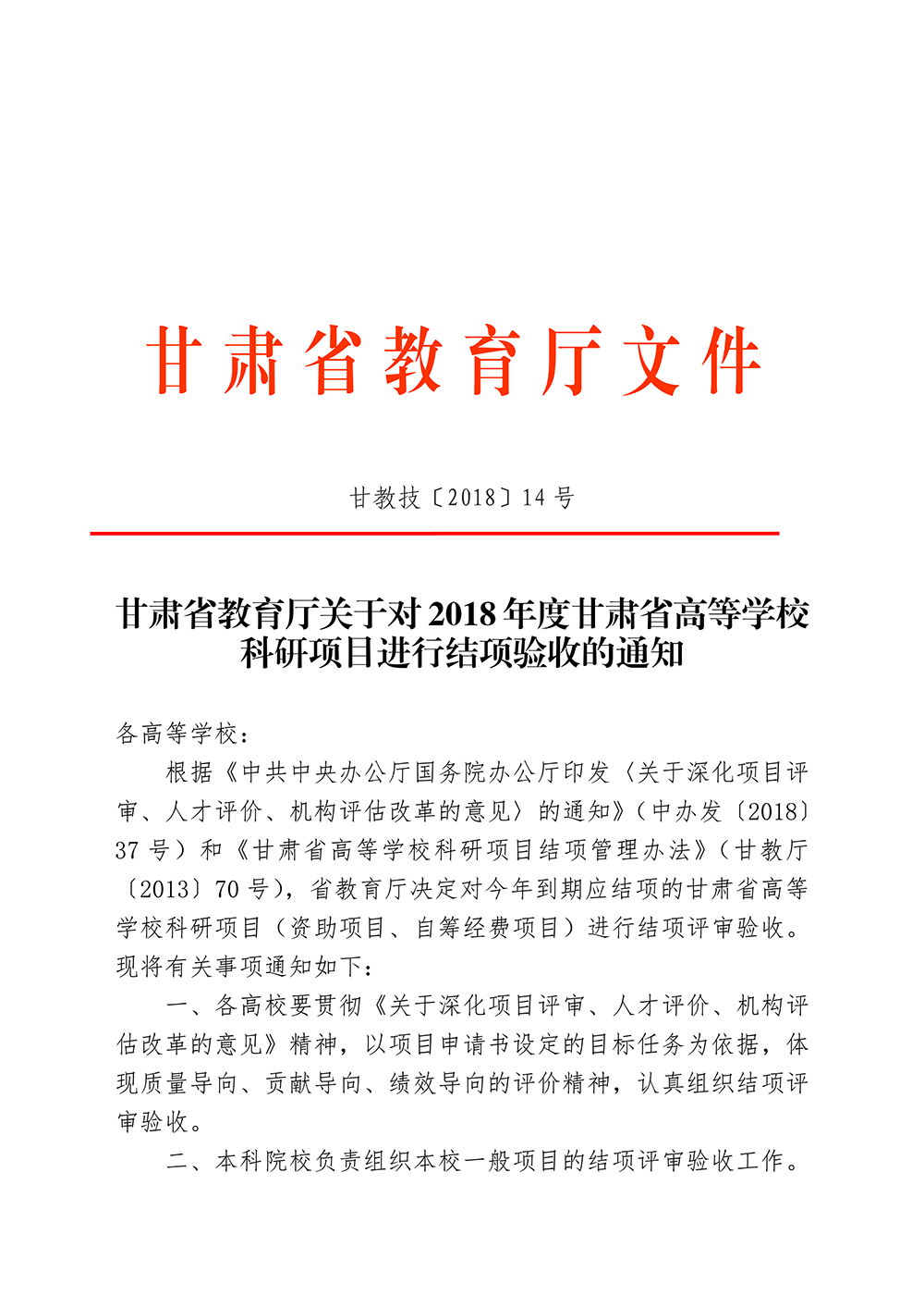 轉(zhuǎn)發(fā)甘肅省教育廳關(guān)于對2018年度甘肅省高等學(xué)??蒲许椖窟M行結(jié)項驗收的通知