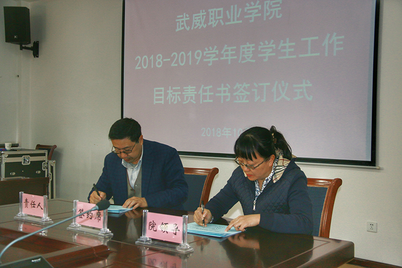 責(zé)任書(shū)簽訂儀式上,田迎春代表學(xué)院與各系黨總支書(shū)記或負(fù)責(zé)人簽訂了《武威職業(yè)學(xué)院2018-2019學(xué)年度學(xué)生工作目標(biāo)責(zé)任書(shū)》。她充分肯定了各系2017-2018學(xué)年的學(xué)生工作,并就我院學(xué)生工作提出了具體要求,一是學(xué)生工作要緊緊圍繞“立德樹(shù)人”的根本任務(wù),樹(shù)立全院全員育人思想,各系要強(qiáng)化學(xué)生工作管理責(zé)任,增強(qiáng)工作主動(dòng)性和責(zé)任性,使學(xué)生管理的各項(xiàng)工作更細(xì)、更實(shí);二是各系要在學(xué)生思想政治教育和日常管理工作中堅(jiān)持誰(shuí)主管誰(shuí)負(fù)責(zé)的原則,力求做到“工作規(guī)范化、管理精細(xì)化、服務(wù)人性化”;三是各系及學(xué)工部門在思想上要與學(xué)院保持高度一致,在工作落實(shí)上與學(xué)院保持相向而行,切實(shí)將目標(biāo)責(zé)任書(shū)的承諾轉(zhuǎn)化為抓工作、謀發(fā)展、促改革的具體行動(dòng);四是要在就業(yè)創(chuàng)業(yè)上下功夫,促進(jìn)畢業(yè)生就業(yè)率有所提高、就業(yè)質(zhì)量不斷上升;五是各系要繼續(xù)發(fā)揚(yáng)勇于創(chuàng)新、開(kāi)拓進(jìn)取的精神,以更飽滿的熱情、更昂揚(yáng)的斗志、更務(wù)實(shí)的作風(fēng)推進(jìn)我院學(xué)生管理工作的科學(xué)發(fā)展。