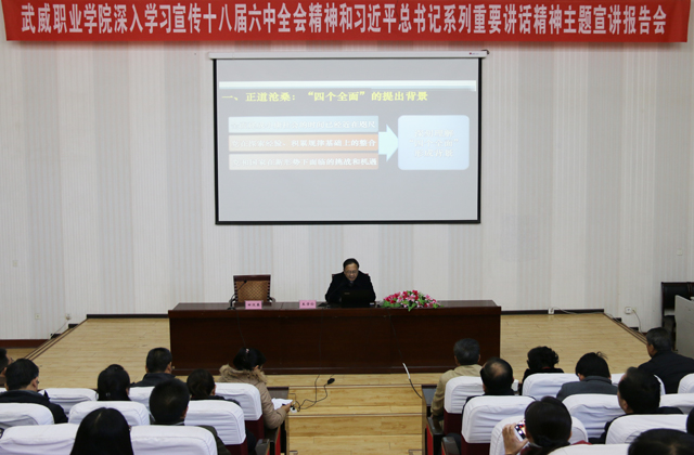 根據(jù)省委和全省宣傳工作會(huì)議關(guān)于在全省組織開(kāi)展深入學(xué)習(xí)宣傳十八屆五中全會(huì)精神和習(xí)近平總書(shū)記系列重要講話精神主題宣講活動(dòng)的通知要求,為向全院黨員干部和師生宣傳好、解讀好十八屆五中、六中全會(huì)精神和習(xí)近平總書(shū)記系列重要講話的實(shí)質(zhì)內(nèi)涵和深遠(yuǎn)意義,將全會(huì)精神和總書(shū)記系列重要講話精神作為指導(dǎo)和推動(dòng)學(xué)院各項(xiàng)事業(yè)快速發(fā)展的科學(xué)理論和強(qiáng)大動(dòng)力。10月29日上午,“武威職業(yè)學(xué)院深入學(xué)習(xí)宣傳十八屆五中、六中全會(huì)精神和習(xí)近平總書(shū)記系列重要講話精神主題宣講報(bào)告會(huì)”在學(xué)院尚德樓正德廳舉行。會(huì)議邀請(qǐng)省委講師團(tuán)成員、蘭州大學(xué)馬克思主義學(xué)院博士生導(dǎo)師王學(xué)儉教授蒞臨學(xué)院,作題為“四個(gè)全面”戰(zhàn)略布局解讀的宣講報(bào)告。學(xué)院黨委副書(shū)記趙明,副院長(zhǎng)王永緒、潘玉華、田迎春,全體中層干部,各部門(mén)師生代表共計(jì)260余人參加宣講報(bào)告會(huì)。報(bào)告會(huì)由田迎春主持。