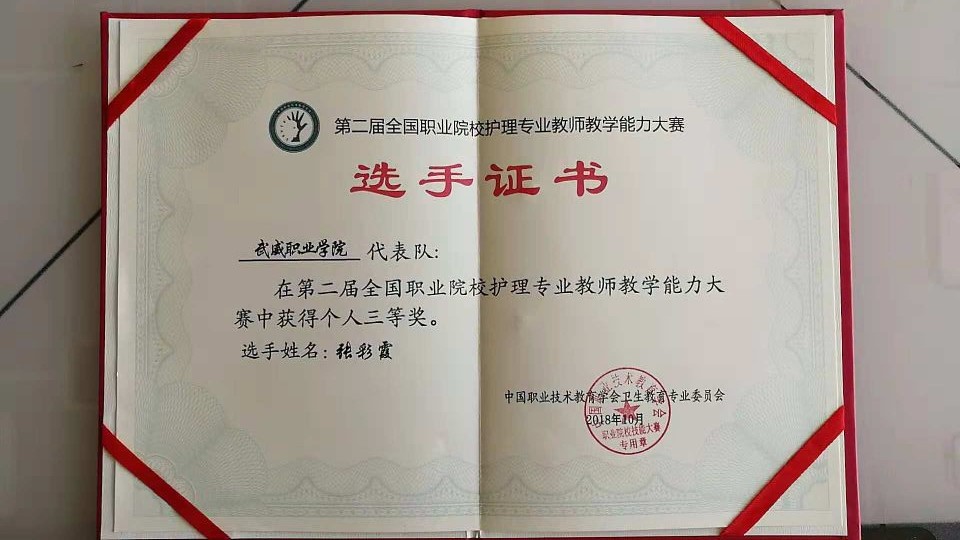競(jìng)賽共分為理論考核、說(shuō)課程和臨床護(hù)理技能操作三個(gè)部分。其中,臨床護(hù)理技能操作部又分為三項(xiàng),心肺復(fù)蘇術(shù)和靜脈輸液操作技術(shù)為必選項(xiàng)目,置胃管技術(shù)和氣管切開護(hù)理技術(shù)為抽選項(xiàng)目。經(jīng)過三天緊張激烈的比拼,通過了全部考核內(nèi)容的綜合評(píng)定,最終張彩霞老師獲得了三等獎(jiǎng)。