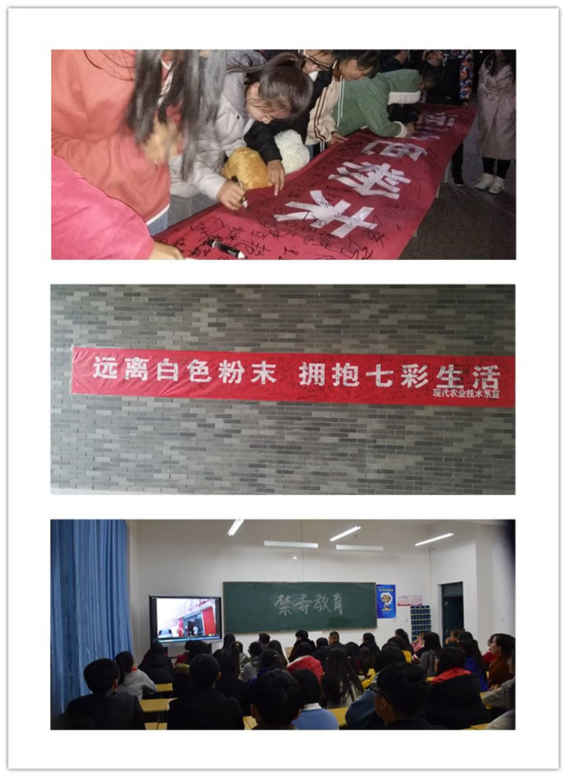 現(xiàn)代農(nóng)業(yè)技術系結合自身實際和條件,重點開展了以下活動。一是通過在行樹樓張貼“遠離白色粉末擁抱七彩生活”禁毒橫幅,號召全系師生創(chuàng)建和諧、文明、無毒的校園環(huán)境;二是各班開展了禁毒宣傳主題班會,宣傳毒品危害,普及防毒知識,警示大家珍愛生命,遠離毒品;三是組織學生參加學院禁毒征文大賽,用語言表達禁毒的決心;四是團學會組織各班同學網(wǎng)上參觀“中國禁毒數(shù)字展覽館”,觀看禁毒題材的優(yōu)秀微電影《一路有你》、《少年的秘密》、《蛻變》、《愛心帶你回家》,讓在場同學深刻感受到毒品的危害,堅定了同學們禁毒防毒的信心。