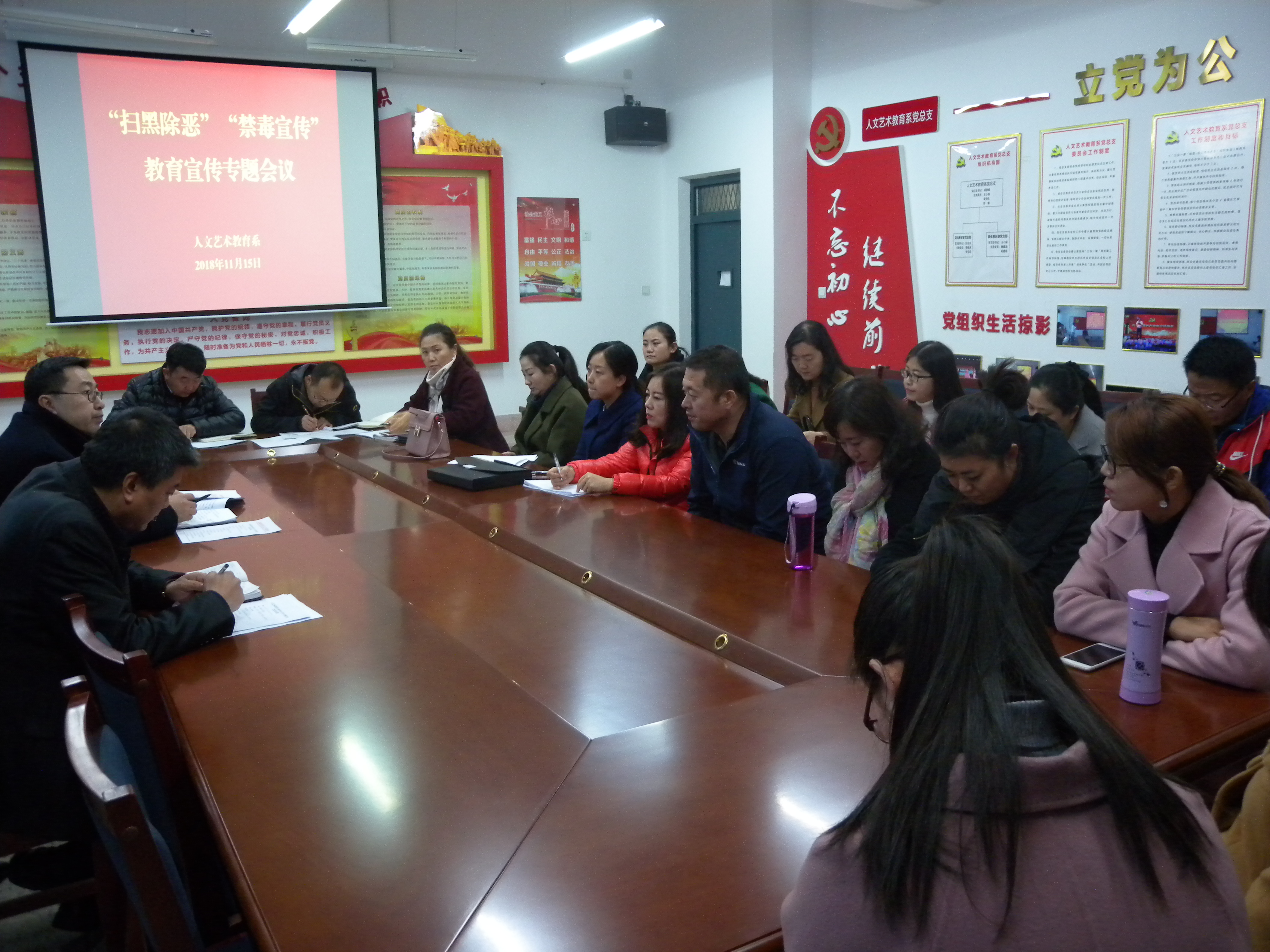 11月15日下午,人文藝術(shù)教育系在勵勤樓209會議室召開了“掃黑除惡”“禁毒宣傳”專項斗爭專題會議,傳達學(xué)習(xí)學(xué)院關(guān)于掃黑除惡專項斗爭工作會議精神,會議由系黨總支書記胡靜峰主持,人文藝術(shù)教育系全體班主任參加了本次會議。