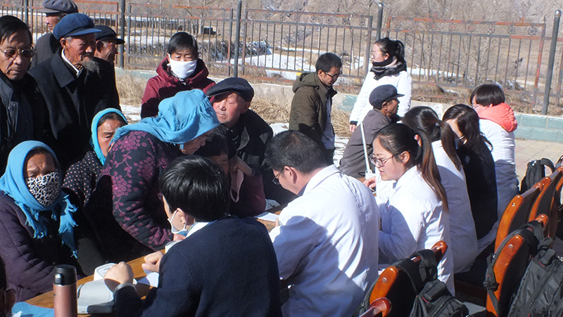 到達(dá)目的地后,黨員們不顧辛勞,分成兩組,一組由護(hù)理系黨總支書(shū)記張建輝帶領(lǐng)前往臥病在床的扶貧對(duì)象家里,親切詢問(wèn)病情及家里近況,送上常備藥品。另一組在當(dāng)?shù)卮宀窟M(jìn)行義診活動(dòng),醫(yī)護(hù)人員仔細(xì)給村民們進(jìn)行體檢,耐心解答、細(xì)心診治;對(duì)前來(lái)問(wèn)診的村民認(rèn)真進(jìn)行血壓、血糖、丙肝等項(xiàng)目的檢測(cè)、免費(fèi)發(fā)放藥品并對(duì)糖尿病、高血壓等慢性病的飲食、活動(dòng)和用藥進(jìn)行指導(dǎo),普及衛(wèi)生常識(shí)和健康知識(shí)。醫(yī)護(hù)人員的精心服務(wù)讓村民們倍感欣慰,受到了他們的熱烈歡迎和一致稱贊。