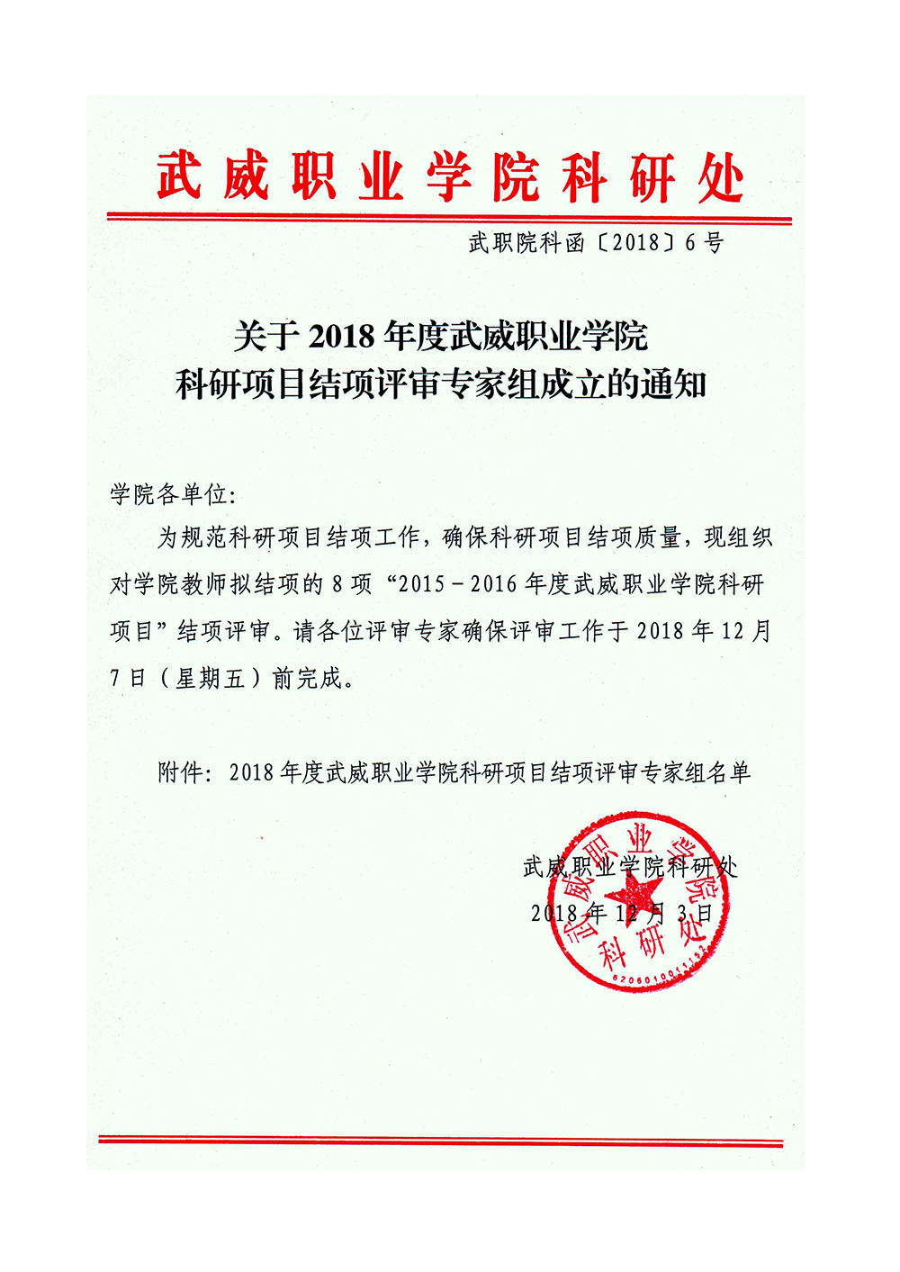 關于2018年度武威職業(yè)學院科研項目結(jié)項評審專家組成立的通知