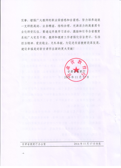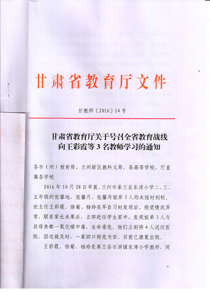 現(xiàn)將《甘肅省教育廳關(guān)于號召全省教育戰(zhàn)線向王彩霞等3名教師學(xué)習(xí)的通知》復(fù)印給你們,請認(rèn)真組織所屬教職工學(xué)習(xí)王彩霞、徐菊 、楊玲3名教師愛崗敬業(yè)、無私奉獻(xiàn)、愛心救人的先進(jìn)事跡。積極在院團(tuán)委、系團(tuán)總支,輔導(dǎo)員和班主任等學(xué)生管理隊(duì)伍中展開學(xué)習(xí)研討活動,深入踐行社會主義核心價值觀,切實(shí)加強(qiáng)學(xué)院意識形態(tài)領(lǐng)域工作,唱響主旋律,大力弘揚(yáng)正能量。