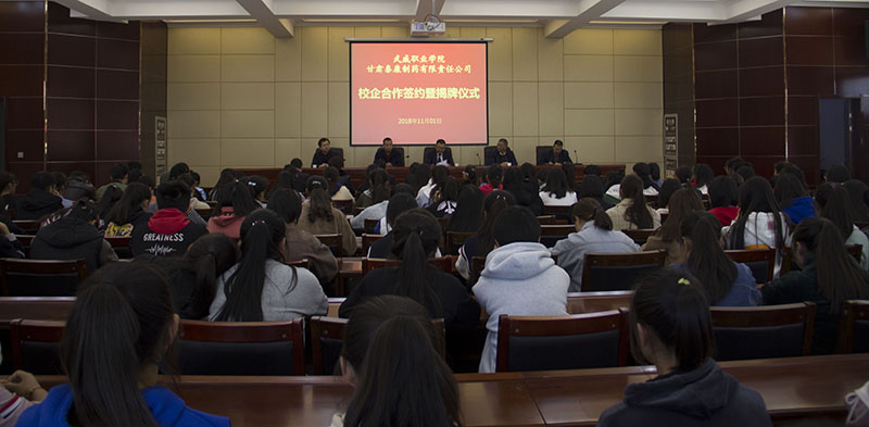 為提高人才培養(yǎng)質(zhì)量和辦學(xué)水平,加強(qiáng)校企協(xié)同育人機(jī)制建設(shè),2018年11月1日下午,藥學(xué)系與甘肅泰康制藥有限責(zé)任公司校企合作共建“就業(yè)實(shí)習(xí)基地”簽約揭牌儀式在行樹樓北側(cè)會議室隆重舉行。甘肅泰康制藥有限責(zé)任公司投資方—北京久朝集團(tuán)產(chǎn)業(yè)中心總監(jiān)楊宏超、公司總工程師毛著鴻、財(cái)務(wù)總監(jiān)郝敏等企業(yè)領(lǐng)導(dǎo)出席本次儀式。學(xué)院教務(wù)處處長仲生仁、招生就業(yè)處處長蔡柱山、藥學(xué)系主任魏潤明、副主任楊建美、黨總支副書記單光年及藥學(xué)系160余名師生參加了此次簽約揭牌儀式。儀式由魏潤明主持。