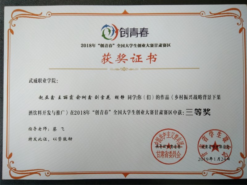 現(xiàn)代農(nóng)業(yè)技術系兩件作品獲得2018年“創(chuàng)青春”全國大學生創(chuàng)業(yè)大賽甘肅賽區(qū)三等獎