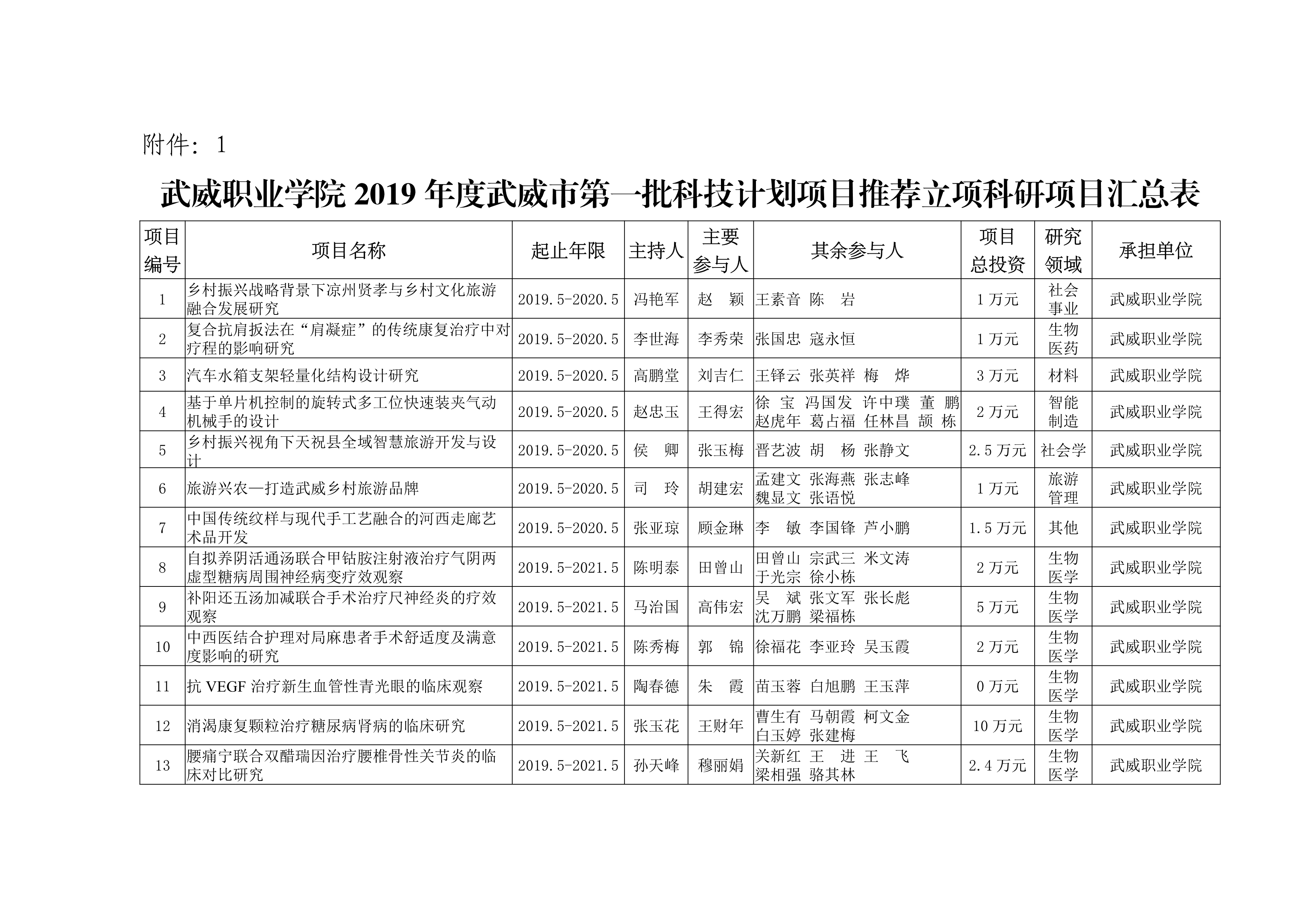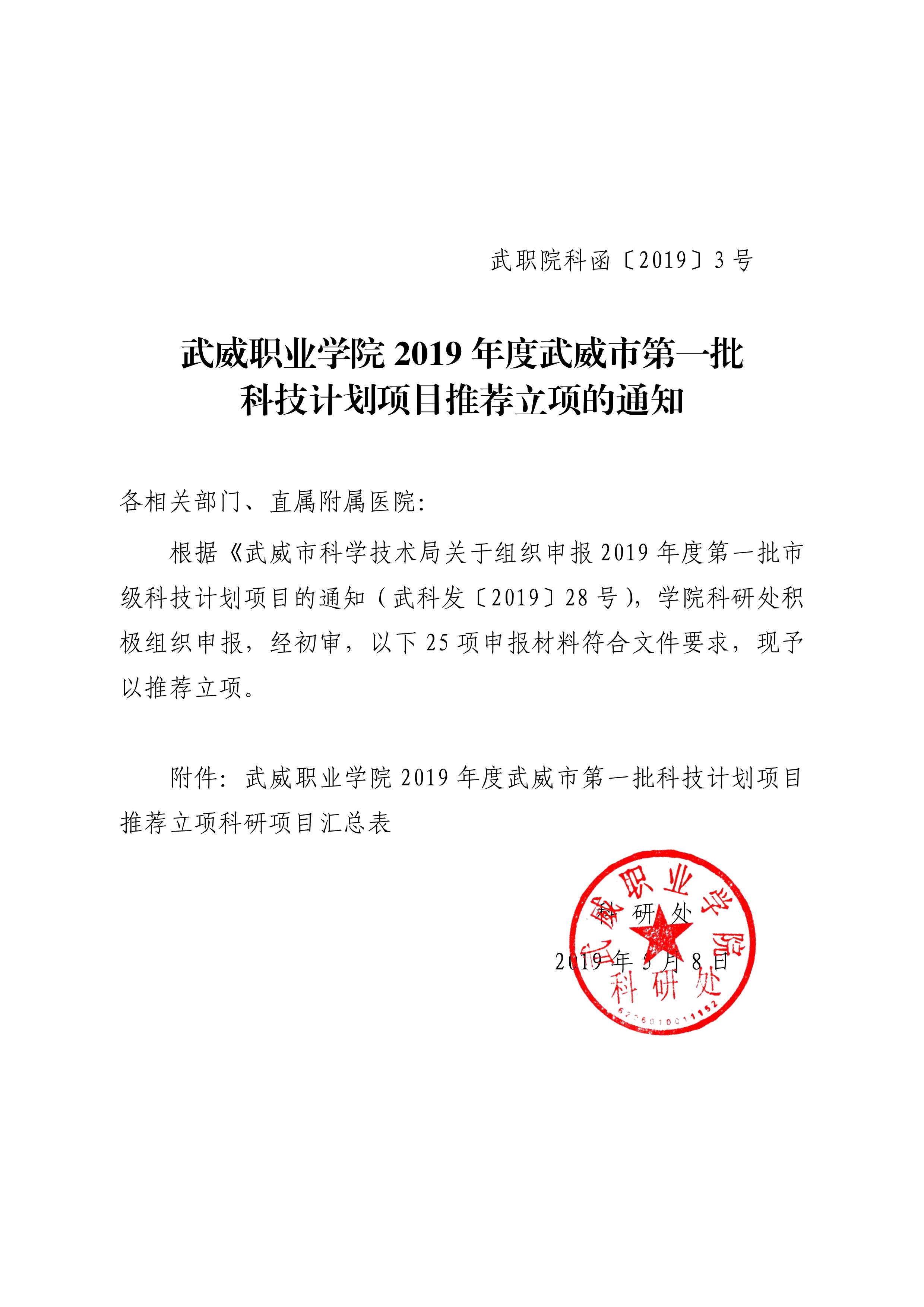 武威職業(yè)學(xué)院2019年度武威市第一批科技計劃項(xiàng)目推薦立項(xiàng)的通知