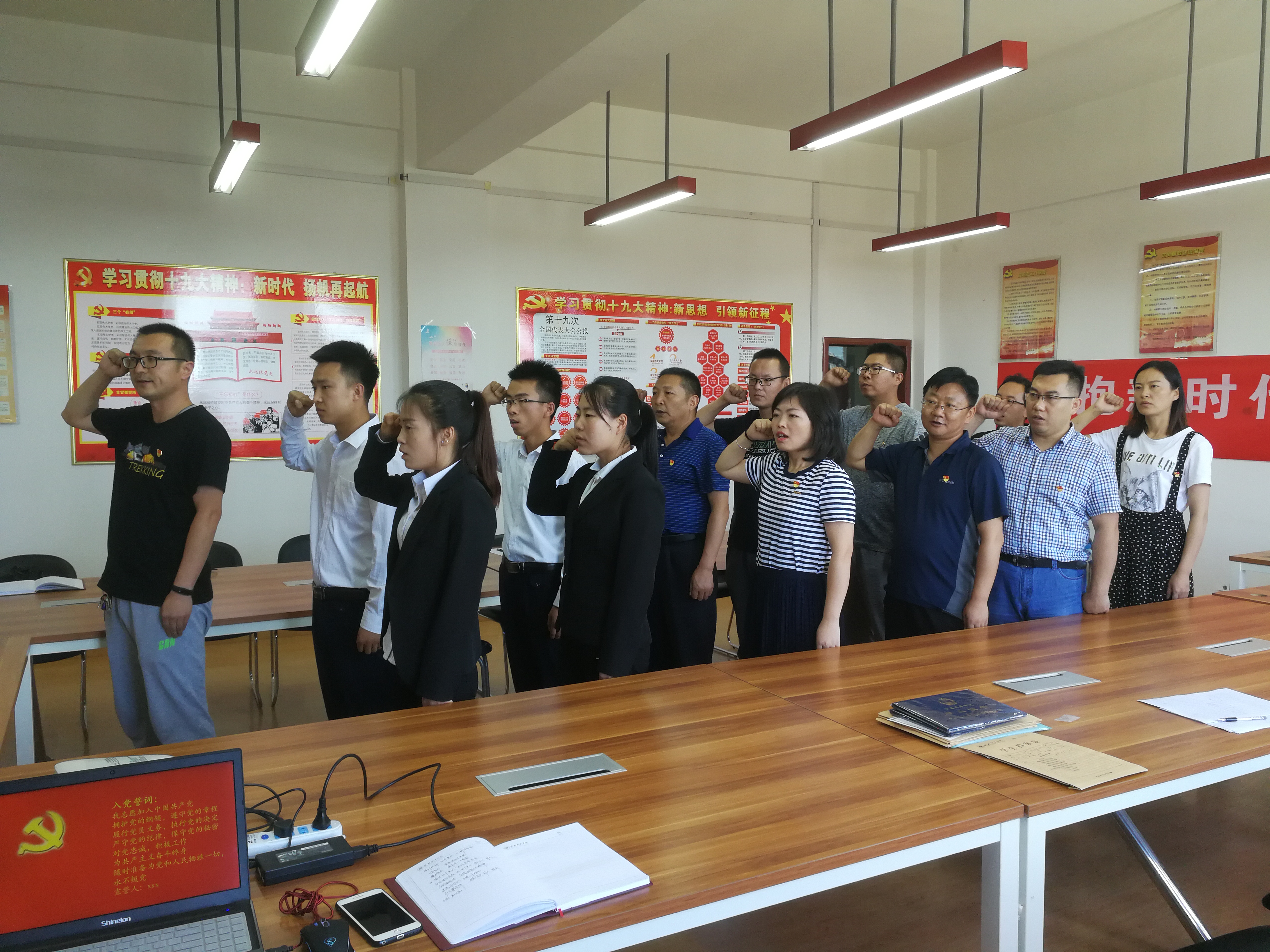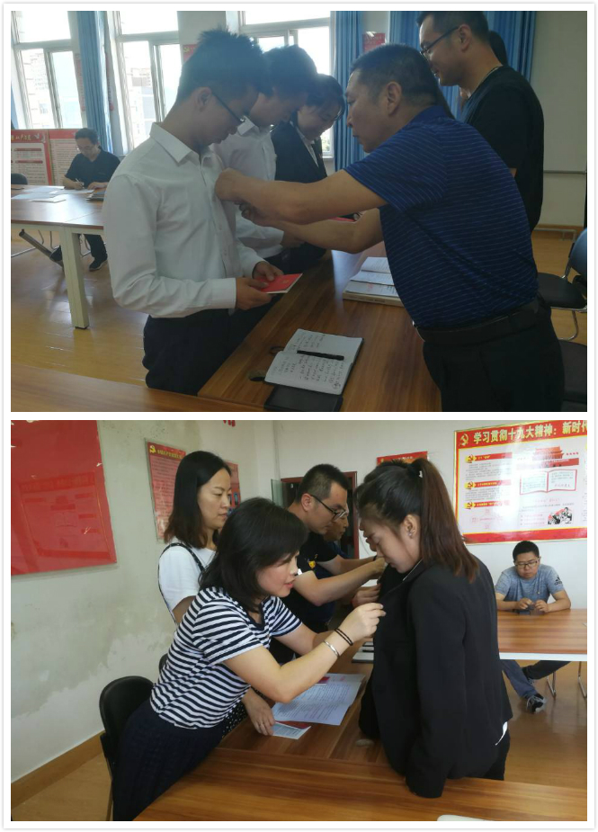 在唐宗舜同志的帶領下,4名預備黨員和全體黨員右手握拳舉過肩頭,面向鮮紅的黨旗,進行了莊嚴宣誓。宣誓結束后,參加宣誓儀式的正式黨員為預備黨員佩戴了黨徽、贈送了《黨章》。