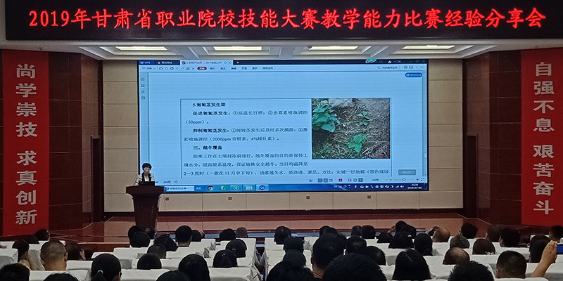 分享會(huì)由翟存祥副院長主持,并就本次參賽意義作了深刻點(diǎn)評(píng),鼓勵(lì)中青年骨干教師積極參賽,以賽促學(xué)、以賽促教。教務(wù)處副處長張世亮介紹了甘肅省2019年職業(yè)院校技能大賽教學(xué)能力比賽規(guī)則和基本流程。邀請(qǐng)參賽優(yōu)秀教師團(tuán)隊(duì)分享參賽作品《耕耘天地間 綠色齊分享》《聲傳意調(diào)頌情 傳播中國聲音》和《堅(jiān)守規(guī)則 守護(hù)生命安全》,展示教學(xué)資料、模擬現(xiàn)場(chǎng)比賽過程、分享比賽經(jīng)驗(yàn)。