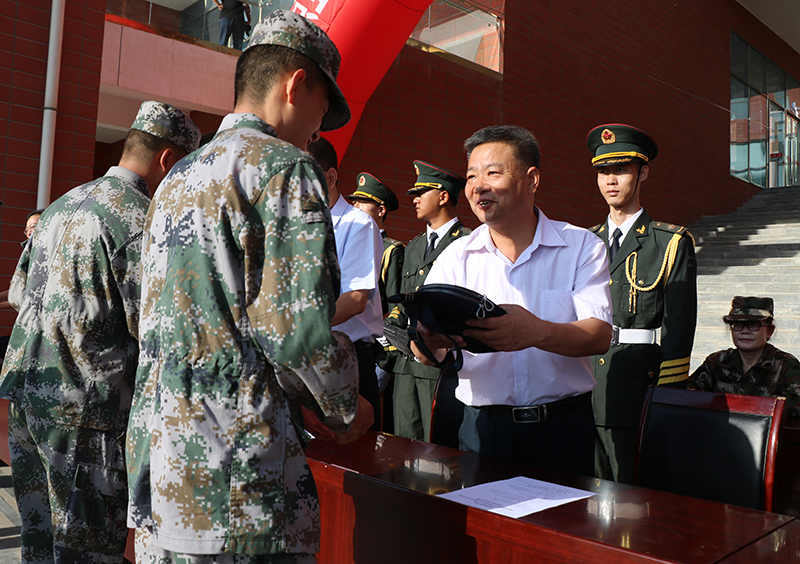 翟存祥代表學(xué)院向軍訓(xùn)教官表示衷心的感謝,祝愿應(yīng)征入伍的同學(xué)們在部隊(duì)進(jìn)一步譜寫人生華章,并向參加軍訓(xùn)的全體同學(xué)致以親切的問候。他指出,舉行大學(xué)生應(yīng)征入伍歡送儀式,就是要鼓勵(lì)大學(xué)生樹立“天下興亡,匹夫有責(zé)”的國防教育觀念,軍訓(xùn)旨在培養(yǎng)同學(xué)們的國防意識和愛國主義精神,培養(yǎng)同學(xué)們的組織紀(jì)律觀念,磨練同學(xué)們意志品德,培育和踐行社會主義核心價(jià)值觀!他要求參訓(xùn)學(xué)生要堅(jiān)守目標(biāo),做遵紀(jì)守法的優(yōu)秀戰(zhàn)士;要刻苦訓(xùn)練,做軍事訓(xùn)練的優(yōu)秀學(xué)子;要?jiǎng)?lì)志成才,做中國特色社會主義合格建設(shè)者和可靠接班人。他希望同學(xué)們牢記習(xí)近平總書記的殷殷囑托、諄諄教誨,不忘初心、牢記使命,勇于擔(dān)當(dāng)這個(gè)時(shí)代賦予的歷史責(zé)任,樹立遠(yuǎn)大理想,堅(jiān)持勵(lì)志勤學(xué),在激情奮斗中綻放青春光芒,立志成為中國特色社會主義偉大事業(yè)的有用人才。