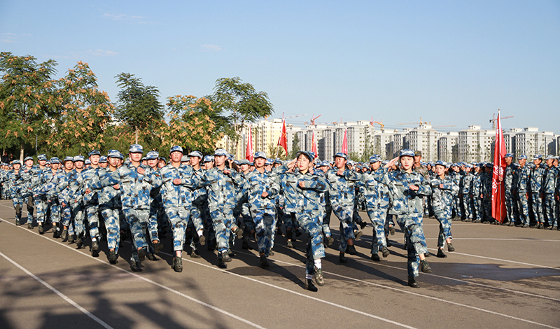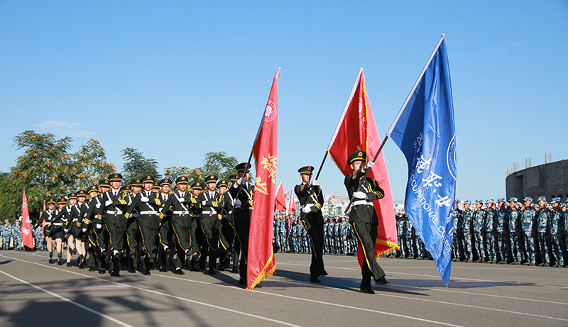 在軍訓總結(jié)大會上,學院紀委書記張富國同志宣布了2019級新生軍訓工作先進集體、先進個人、軍訓標兵名單。學院領(lǐng)導為軍訓工作先進集體、先進個人、軍訓標兵代表頒獎。學院黨委書記、院長、軍訓團政委趙明同志代表學院向關(guān)心這次軍訓的中國人民解放軍某部軍訓隊致以崇高的敬意,向14天來辛勤奮戰(zhàn)在訓練一線的55位教官表示衷心的感謝,并贈送錦旗。向堅守在訓練現(xiàn)場的各系輔導員、班主任致以誠摯的問候,向不怕吃苦、頑強拼搏、圓滿完成軍訓任務(wù)的同學們表示熱烈的祝賀!