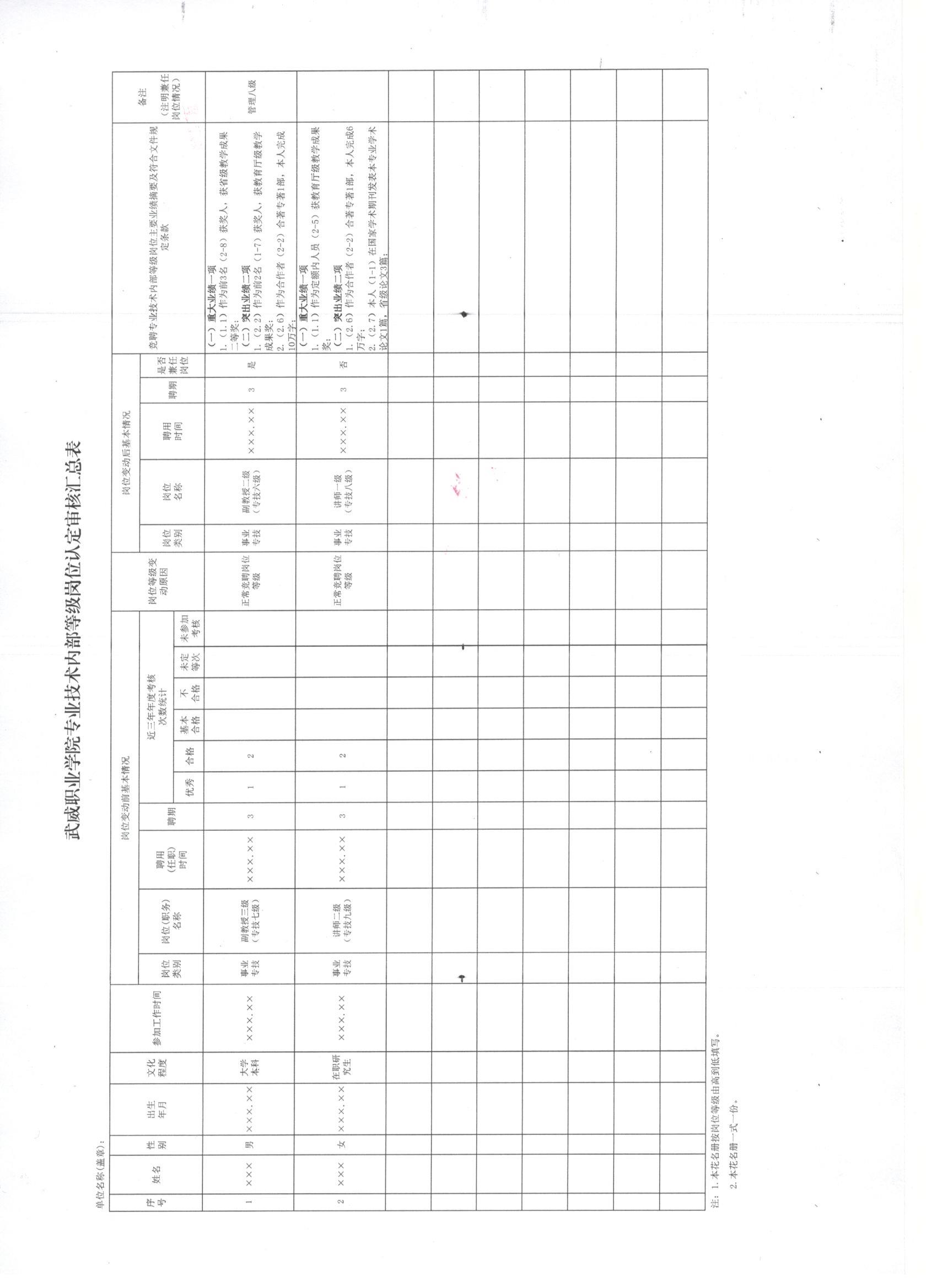 武威職業(yè)學(xué)院專業(yè)技術(shù)內(nèi)部等級(jí)崗位認(rèn)定審核匯總表2019 - 樣表