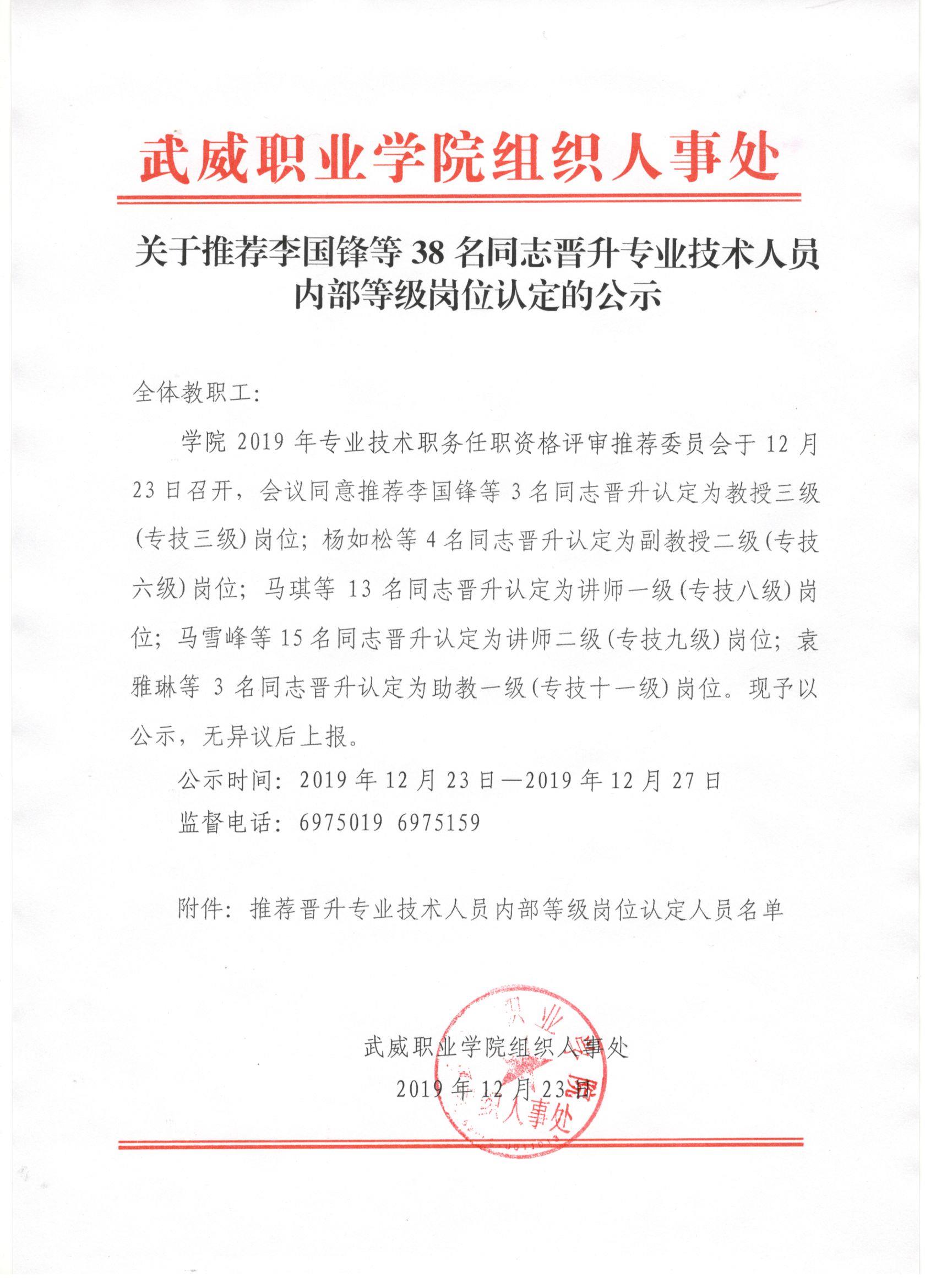 關(guān)于推薦李國鋒等38名同志晉升專業(yè)技術(shù)人員內(nèi)部等級崗位認定的公示