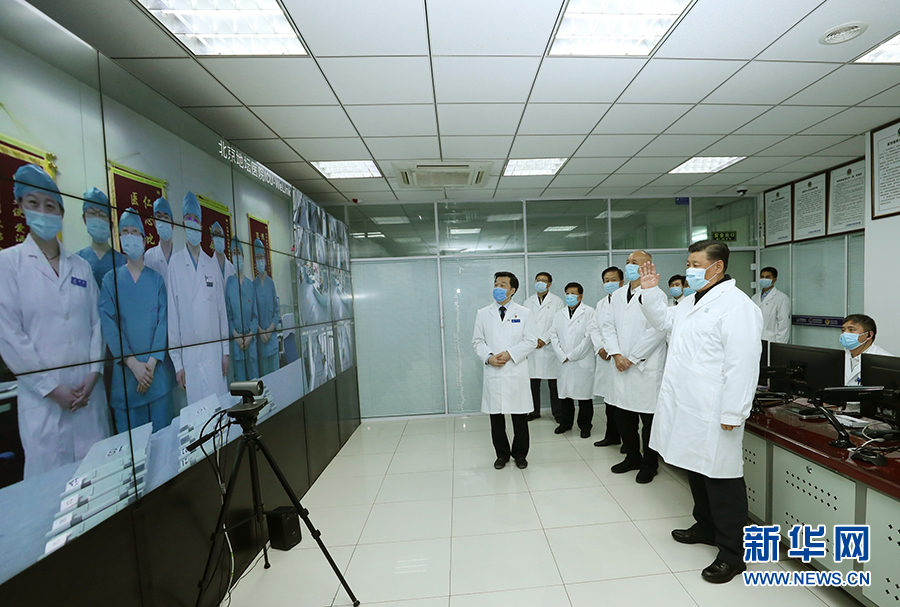自今年1月12日起,首都醫(yī)科大學(xué)附屬北京地壇醫(yī)院開始承擔(dān)新冠肺炎患者的救治、篩查、隔離工作,收治了北京市第一例確診病例。習(xí)近平來到地壇醫(yī)院門診樓一層運行監(jiān)控中心,通過監(jiān)控畫面察看患者住院診療情況,并視頻連線正在病房值班的醫(yī)務(wù)人員,鼓勵他們繼續(xù)完善診療方案,繼續(xù)全力以赴救治患者,努力提高收治率和治愈率、降低感染率和病亡率,并叮囑他們做好自我防護。