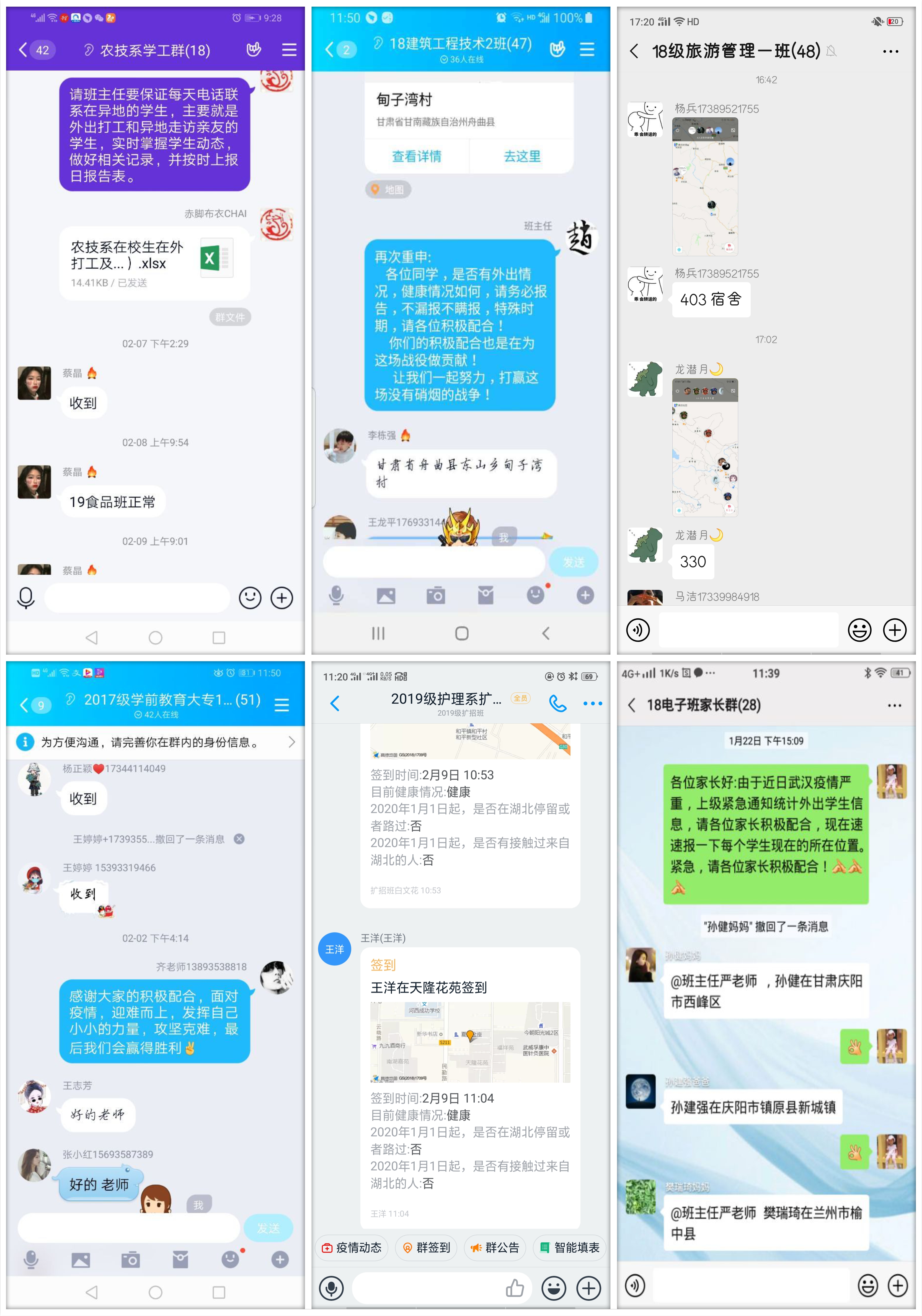 各院系輔導(dǎo)員和班主任每天都會不厭其煩的利用微信群、QQ群、釘釘群、電話等方式督促學(xué)生反饋動向和健康信息,清楚每一位學(xué)生當(dāng)日在何處,清楚每一位學(xué)生當(dāng)日是否健康,認(rèn)真核查確認(rèn)疫情數(shù)據(jù)信息,力求上報(bào)的每個(gè)疫情數(shù)據(jù)統(tǒng)計(jì)準(zhǔn)確無誤,為學(xué)校和上級部門的防控工作提供有力的數(shù)據(jù)支撐。