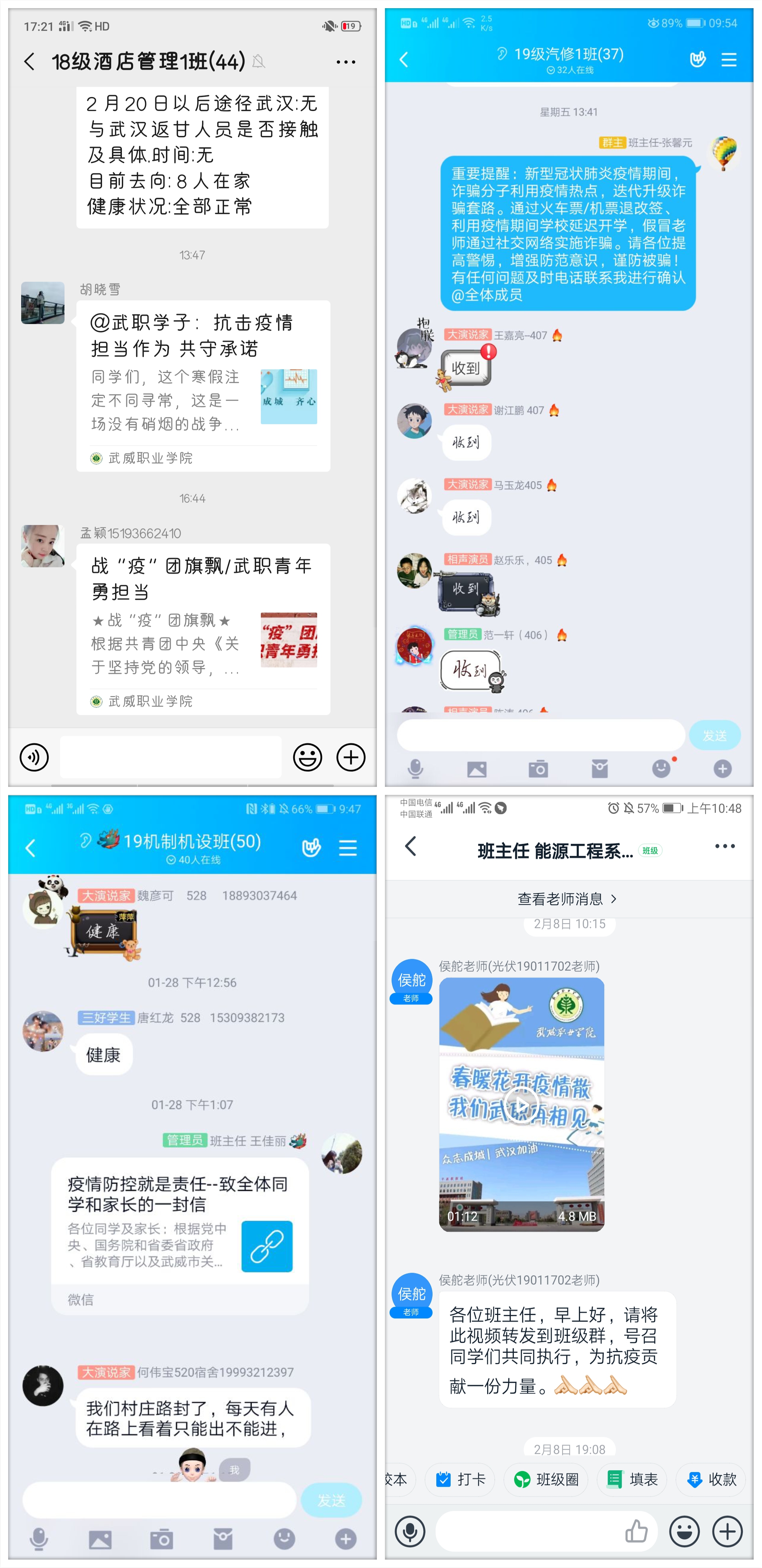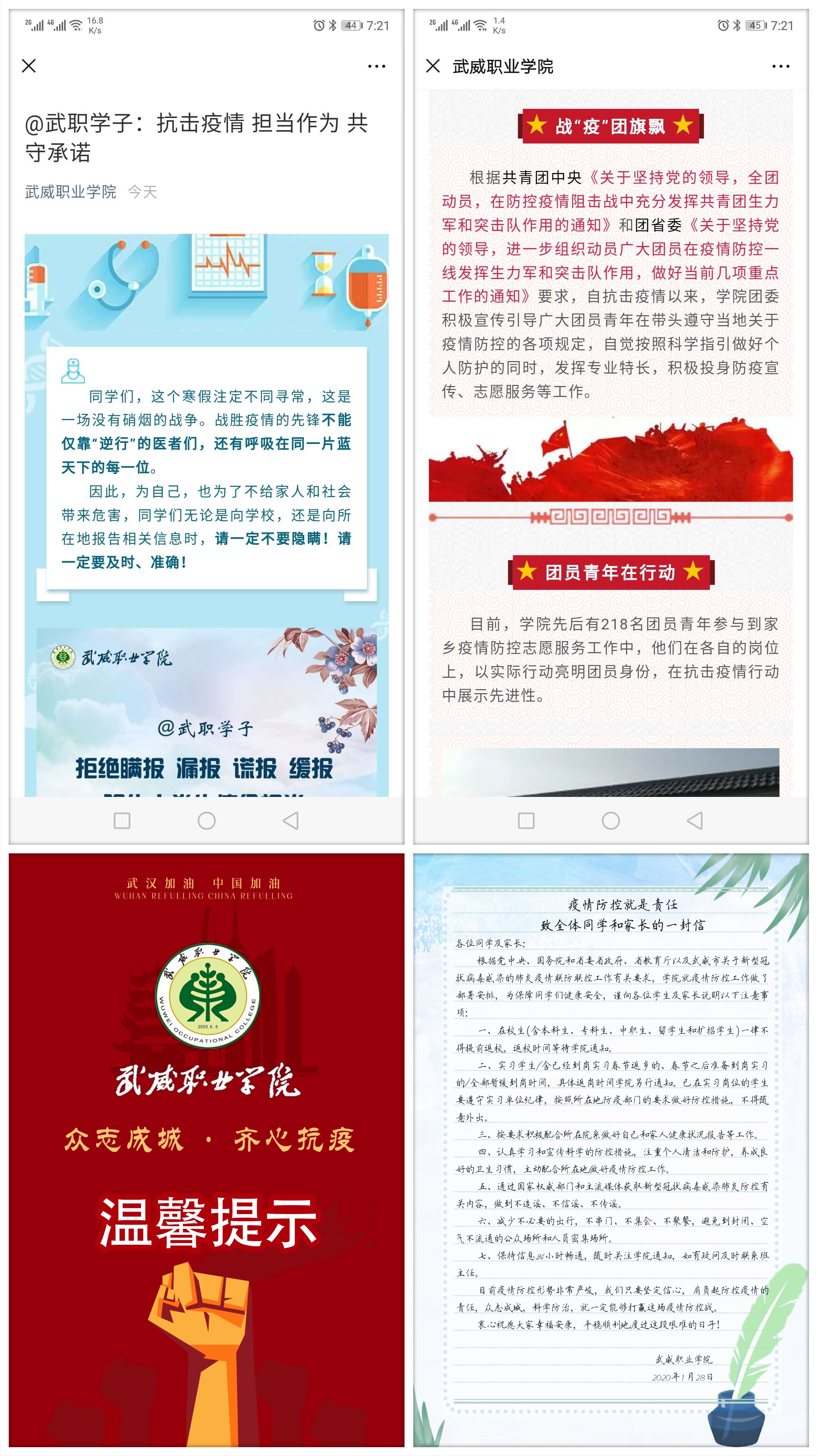 學(xué)生工作處及時(shí)發(fā)布了致學(xué)生和家長的一封信《疫情防控就是責(zé)任》,團(tuán)委制作和推送了《春暖花開疫情散 我們武職再相見》溫馨提示短片和《@武職學(xué)子:抗擊疫情 擔(dān)當(dāng)作為 共守承諾》倡議,用生動形象的表述要求和提醒同學(xué)們不得提前返校,做好個(gè)人防護(hù)措施,遵守當(dāng)?shù)匾咔榉揽馗黜?xiàng)要求,做到不信謠不傳謠,及時(shí)向?qū)W院報(bào)送個(gè)人防疫相關(guān)信息,不瞞報(bào)不慌報(bào)。各院系輔導(dǎo)員和班主任都會第一時(shí)間在學(xué)生群里轉(zhuǎn)發(fā),同時(shí)把學(xué)院網(wǎng)站和微信平臺上科學(xué)的防控知識和上級的有關(guān)精神及時(shí)傳達(dá)給學(xué)生,當(dāng)好疫情防控的宣傳員,做到戰(zhàn)疫有“力”。