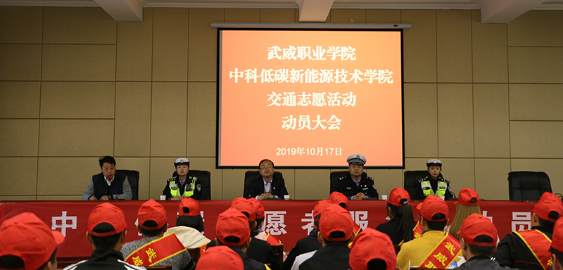 為進(jìn)一步助力全國文明城市創(chuàng)建,10月17日下午武威職業(yè)學(xué)院中科低碳新能源技術(shù)學(xué)院在行樹樓報告廳召開交通志愿活動動員大會。武威市涼州區(qū)公安局交警大隊(duì)副隊(duì)長趙國權(quán),宣傳中隊(duì)馬靜、明如霞;武威職業(yè)學(xué)院能源工程系黨總支書記黃文源,中科低碳新能源技術(shù)學(xué)院輔導(dǎo)員付江鵬及中科低碳新能源技術(shù)學(xué)院志愿者服務(wù)隊(duì)全體成員參加了此次會議。