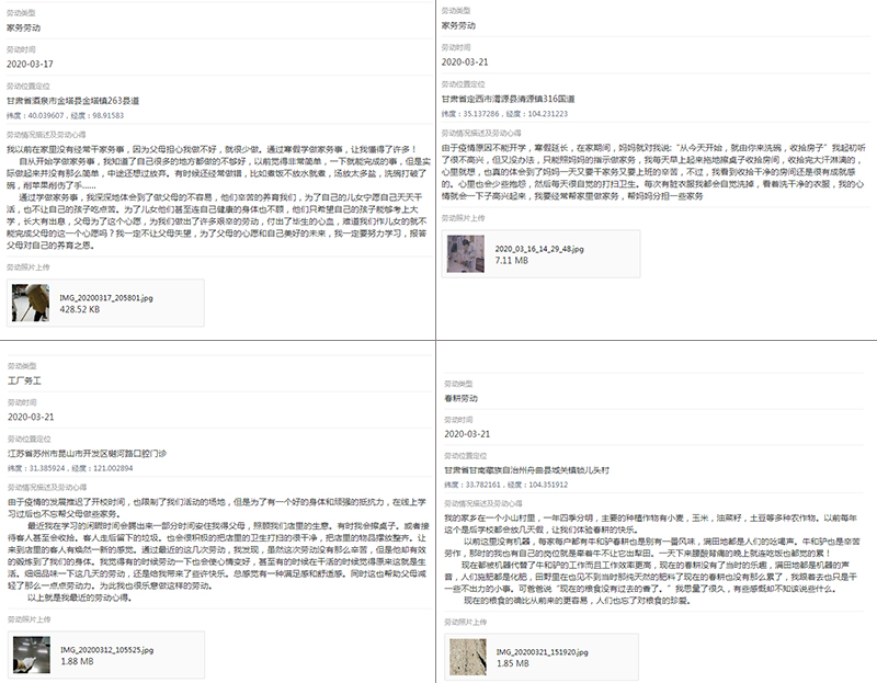 結(jié)合同學(xué)們生活和學(xué)習(xí)實(shí)際,學(xué)工處要求廣大同學(xué)積極參與志愿服務(wù)、春耕勞動(dòng)、工廠(chǎng)務(wù)工、家務(wù)勞動(dòng)等方面勞動(dòng)實(shí)踐,完成每周不少于2小時(shí)的實(shí)踐鍛煉,并通過(guò)信息化平臺(tái)上報(bào)活動(dòng)照片和勞動(dòng)心得。