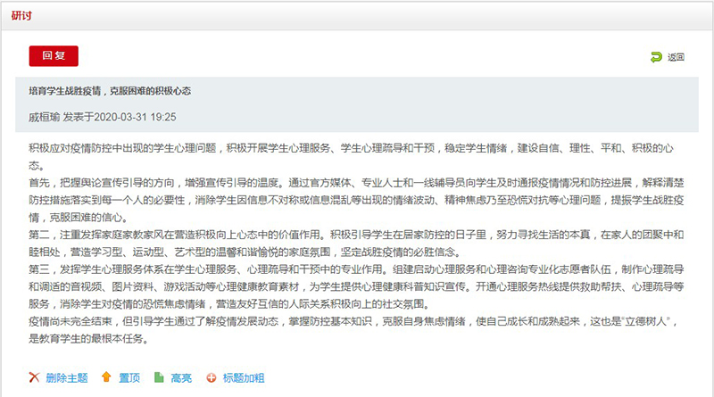 學(xué)生工作處教師姚斌表示,本次培訓(xùn)對輔導(dǎo)員角色定位及工作職責(zé)有了更深一步的認(rèn)知,對開展疫情防控工作、提升危機處理能力、守護學(xué)生身心健康起到指導(dǎo)作用,能幫助我們及時掌握特殊時期學(xué)生思想特點和行為特征,指導(dǎo)今后的工作。