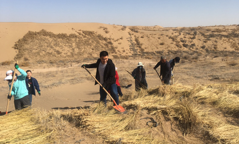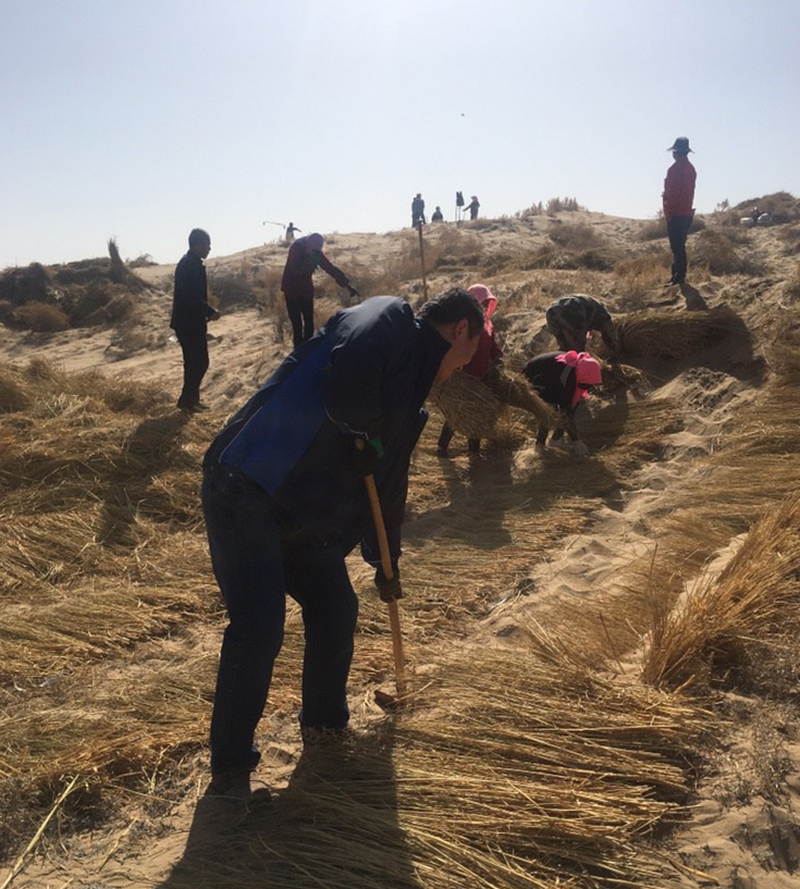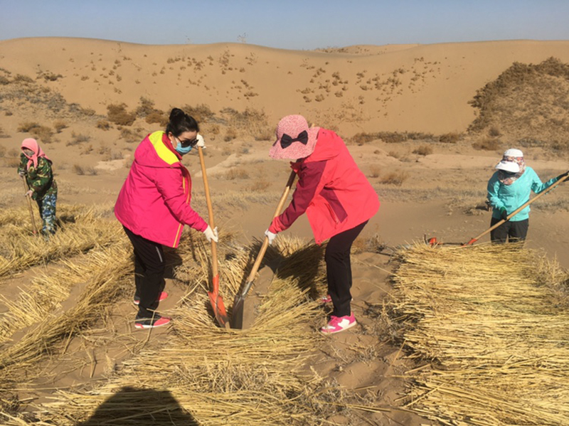 全體壓沙人員不怕吃苦、不怕流汗,爭(zhēng)先恐后投入壓沙勞動(dòng)中。分工合作,有的開(kāi)溝,有的鋪草,有的壓沙,整齊的麥草方格由一排排向一片片不斷延伸,一個(gè)個(gè)沙丘逐漸被麥草網(wǎng)格牢牢鎖住。