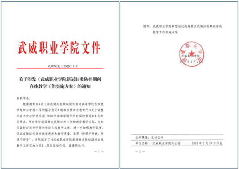 1月27日,學(xué)院新型冠狀病毒感染肺炎疫情聯(lián)防聯(lián)控工作領(lǐng)導(dǎo)小組召開(kāi)會(huì)議,決定從1月28日開(kāi)始停止學(xué)院一切線(xiàn)下教學(xué)活動(dòng),并組織擬訂學(xué)院在線(xiàn)教學(xué)工作方案。2月4日,學(xué)院初步制定完成《武威職業(yè)學(xué)院新型冠狀病毒肺炎疫情防控期間在線(xiàn)教學(xué)工作實(shí)施方案》并面向全院征求意見(jiàn),同時(shí)要求各教學(xué)系積極謀劃、科學(xué)論證,制定各系在線(xiàn)教學(xué)工作實(shí)施方案。2月8日-14日,教務(wù)處陸續(xù)向各教學(xué)系推送教育部發(fā)布的各大教學(xué)平臺(tái)支持高校開(kāi)展在線(xiàn)教學(xué)服務(wù)方案,并篩選中國(guó)大學(xué)MOOC、人衛(wèi)慕課、超星慕課、學(xué)銀在線(xiàn)等教學(xué)平臺(tái)推出的課程資源供各系參考使用,同時(shí)指導(dǎo)各系做好課程在線(xiàn)教學(xué)計(jì)劃編制工作。