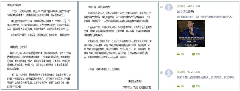 《中華優(yōu)秀傳統(tǒng)文化》課程團(tuán)隊(duì)的馮文娟老師在開(kāi)學(xué)第一天借助在線(xiàn)教學(xué)平臺(tái)向?qū)W生推送了《致2019級(jí)學(xué)生的一封信》,激勵(lì)學(xué)生要敬畏自然、珍愛(ài)生命,致敬英雄、感恩榜樣,寬闊心胸、厚植家國(guó)情懷。信中這樣寫(xiě)道:“在疫情防控中,我們無(wú)時(shí)無(wú)刻不在感受?chē)?guó)家的力量,正因?yàn)橛羞@樣強(qiáng)大的力量,讓我們?cè)诶щy面前堅(jiān)守責(zé)任,無(wú)私奉獻(xiàn),眾志成城,充滿(mǎn)信心地迎接戰(zhàn)勝疫情的勝利曙光?!薄?家是最小國(guó),國(guó)是千萬(wàn)家。在這個(gè)沒(méi)有硝煙的戰(zhàn)場(chǎng),建造武漢火神山、雷神山醫(yī)院的中國(guó)速度,證明了我們擁有戰(zhàn)勝疫情的強(qiáng)大力量;捐資捐物,證明了我們有打贏疫情阻擊戰(zhàn)的中國(guó)精神;全國(guó)人民上下一心,自我隔離,更體現(xiàn)了我們共同戰(zhàn)勝困難的堅(jiān)定決心。春天已到,歷經(jīng)苦寒依舊傲然的梅花,定將帶著勝利的消息和沁人的花香一同到來(lái)?!蓖瑫r(shí),為學(xué)生推送由央視頻和有道精品課共同錄制的《面對(duì)疫情教你如何有效防范》疫情防控專(zhuān)題視頻,與學(xué)生一起為打贏新冠肺炎疫情防控阻擊戰(zhàn)貢獻(xiàn)力量。