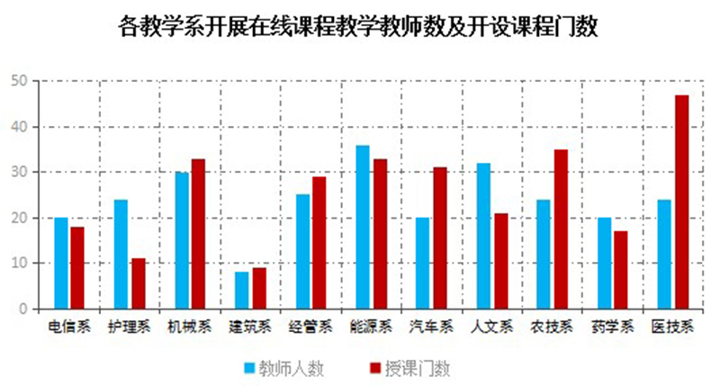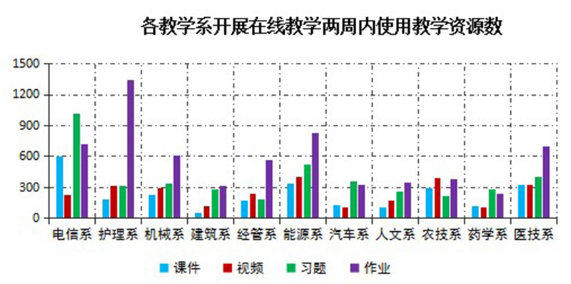 根據(jù)學(xué)院教學(xué)平臺(tái)管理數(shù)據(jù)和各教學(xué)系反饋數(shù)據(jù),開(kāi)課兩周內(nèi)全院開(kāi)展在線(xiàn)教學(xué)教師共有263人,開(kāi)設(shè)課程284門(mén);學(xué)院兩周內(nèi)授課課時(shí)總數(shù)達(dá)到1949學(xué)時(shí),教師開(kāi)展在線(xiàn)教學(xué)3334人次;發(fā)布作業(yè)共計(jì)1306次,組織答疑討論1918次。教師教學(xué)形式靈活多樣,對(duì)教學(xué)平臺(tái)及教學(xué)工具的熟練程度逐漸提升,教師討論交流的主題從基礎(chǔ)性的上傳資源、組織教學(xué)、組織教學(xué)等轉(zhuǎn)變?yōu)樽鳂I(yè)發(fā)布、主題討論、學(xué)情數(shù)據(jù)分析,在線(xiàn)教學(xué)工作步入正軌。