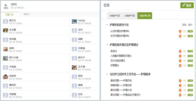 根據(jù)教學(xué)實(shí)際,護(hù)理制定了線(xiàn)上教學(xué)工作方案,對(duì)線(xiàn)上教學(xué)工作做出統(tǒng)一安排,強(qiáng)調(diào)了線(xiàn)上教學(xué)督導(dǎo)、任課教師和班主任的具體工作職責(zé)。2月24日,各項(xiàng)教學(xué)工作有序開(kāi)展。共24名教師完成 11門(mén)課程的在線(xiàn)教學(xué)任務(wù),主要依托學(xué)院在線(xiàn)教學(xué)平臺(tái)、中國(guó)大學(xué)MOOC、人衛(wèi)慕課、智慧職教平臺(tái)上完成授課,上課學(xué)生1510人。通過(guò)多層次多方位的監(jiān)控?cái)?shù)據(jù)分析,全系在線(xiàn)教學(xué)整體運(yùn)行平穩(wěn)有序,管理人員組織管理到位,教師盡職盡責(zé),課堂授課方式靈活多樣,學(xué)生積極互動(dòng),在線(xiàn)教學(xué)課堂效果良好,達(dá)到預(yù)期。學(xué)生平均到課率達(dá)到99%以上,積極落實(shí)了在線(xiàn)教學(xué)對(duì)學(xué)生“全覆蓋”的要求。教師在教學(xué)平臺(tái)上完成視頻、電子教材、PPT等資源上傳,積極開(kāi)展課前預(yù)習(xí)、主題討論、隨堂測(cè)驗(yàn)、作業(yè)布置等各類(lèi)線(xiàn)上課堂教學(xué)活動(dòng),充分調(diào)動(dòng)學(xué)生的學(xué)習(xí)主動(dòng)性,學(xué)習(xí)效果良好。