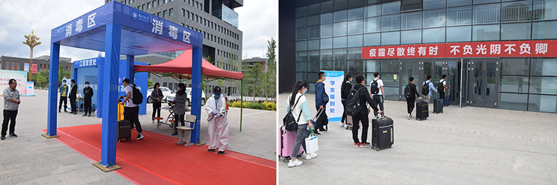 學(xué)院在校門口設(shè)置了測溫通道,消毒區(qū)、口罩發(fā)放區(qū)、臨時觀察區(qū)等,為同學(xué)們的健康安全保駕護(hù)航。學(xué)生到校后,依次通過測溫區(qū)、消毒區(qū),經(jīng)工作人員嚴(yán)格的測溫和消毒后,更換口罩到指定地點報到。