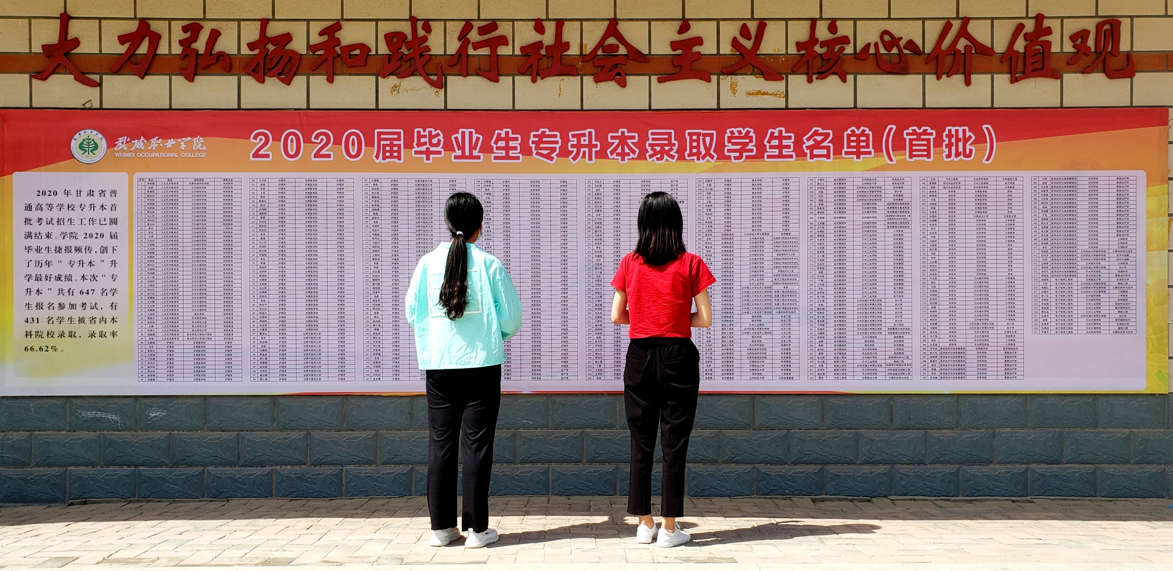 2020年甘肅省普通高等學(xué)校專升本首次考試招生工作已圓滿結(jié)束。學(xué)院2020屆畢業(yè)生捷報頻傳,創(chuàng)下了歷年“專升本”升學(xué)的最好成績。本次“專升本”共有647名學(xué)生報名參加考試,有431名學(xué)生被省內(nèi)本科院校錄取,錄取率為66.62%。