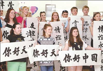 ④ 6月10日,在天津國際漢語學(xué)院,參與“妙筆練書法”活動(dòng)的蘇格蘭師生展示自己的作品。