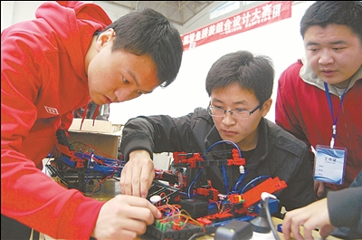 ⑥4月12日,江蘇科技大學(xué)舉辦首屆慧魚機(jī)器人拼裝組合設(shè)計(jì)大賽,圖為大學(xué)生在進(jìn)行機(jī)器人拼裝比賽。