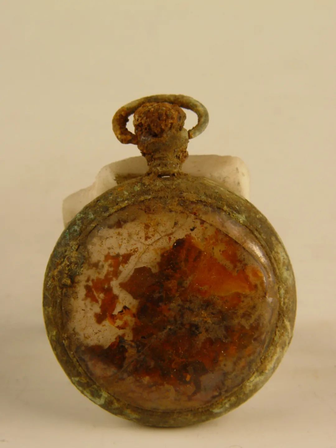 這只懷表于1971年從撫順平頂山慘案遺址出土,表蒙有明顯的裂痕,表盤(pán)內(nèi)已經(jīng)沒(méi)有指針。雖然銹蝕嚴(yán)重,但仍能看到被火燒過(guò)的痕跡。這只沒(méi)有指針的懷表,凝固了時(shí)間,也凝固了侵華日軍的滔天罪行。