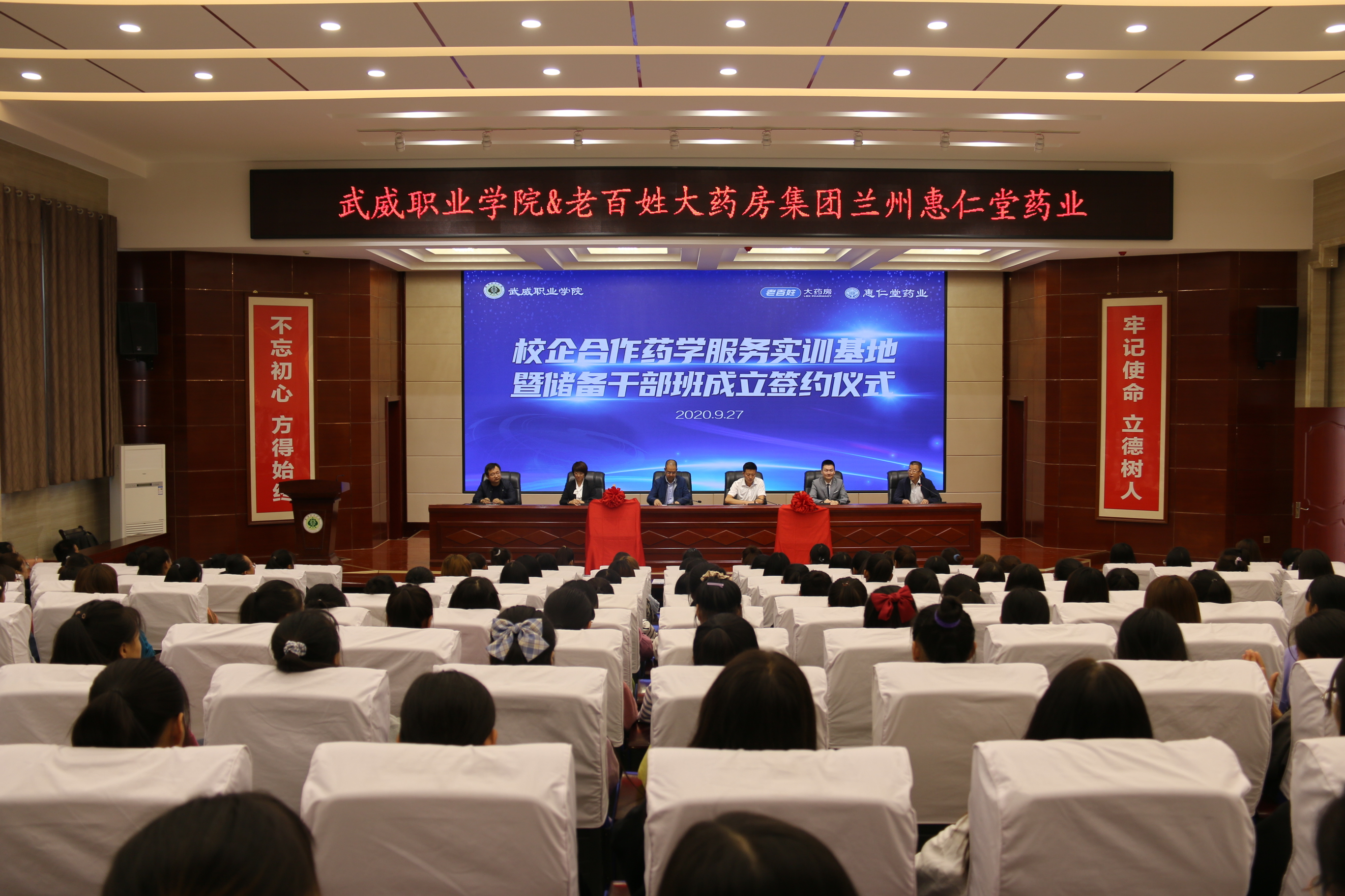 校企合作再起航,實訓(xùn)又添新力量!9月27日,武威職業(yè)學(xué)院藥學(xué)系與蘭州惠仁堂藥業(yè)連鎖有限責(zé)任公司 “校企合作藥學(xué)服務(wù)實訓(xùn)基地”暨儲備干部班成立簽約儀式在菁英廳隆重舉行,武威職業(yè)學(xué)院黨委副書記翟存祥,武威職業(yè)學(xué)院藥學(xué)系黨總支書記、主任魏潤明、武威職業(yè)學(xué)院藥學(xué)系副主任楊建美,老百姓大藥房集團人才開發(fā)經(jīng)理李滄,蘭州惠仁堂藥業(yè)連鎖有限責(zé)任公司裴子鑫總監(jiān),蘭州惠仁堂藥業(yè)連鎖有限責(zé)任公司人力資源部部長岳莉萍共同出席簽約儀式。