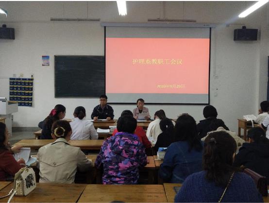 為深入學習貫徹習近平總書記教育重要論述及講話精神,安排國慶中秋放假相關工作,9月29日下午,護理系在明遠樓205教室召開教職工會議,會議由護理系黨總支書記張建輝主持,全體教職工參加會議。
