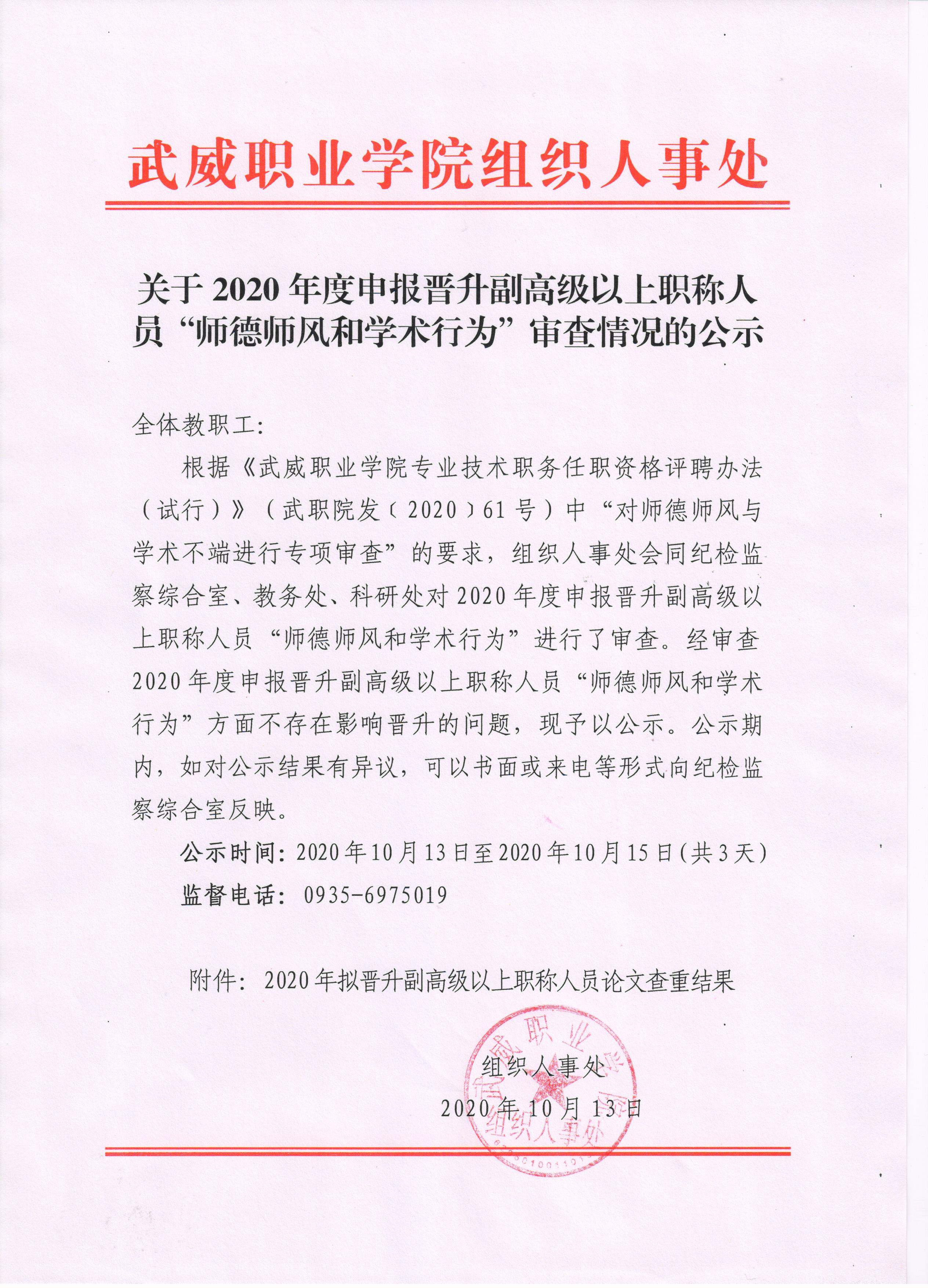 關(guān)于2020年度申報晉升副高級以上職稱人員“師德師風和學(xué)術(shù)行為”審查情況的公示