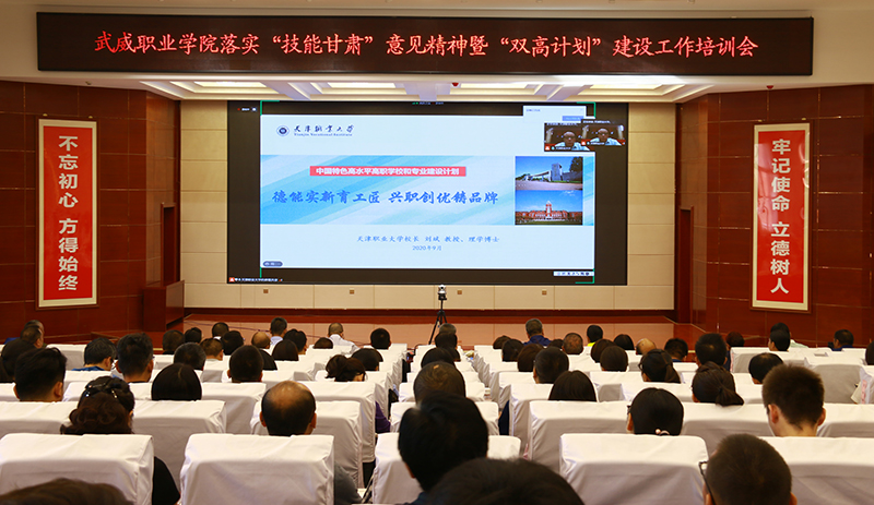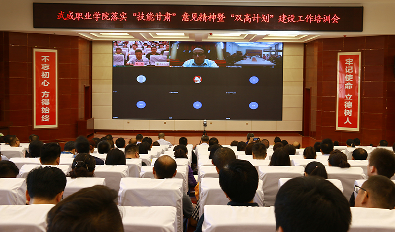 9月4日,學(xué)院在大學(xué)生活動(dòng)中心菁英廳召開了武威職業(yè)學(xué)院落實(shí)“技能甘肅”意見精神暨“雙高計(jì)劃”建設(shè)培訓(xùn)會(huì),黨委書記、院長趙明主持會(huì)議并講話,黨委副書記翟存祥,黨委委員、副院長王永緒、田迎春、何毅,黨委委員、紀(jì)委書記、監(jiān)察專員陳曉煜,黨委委員、副院長王守云出席會(huì)議。全體中層干部、專業(yè)帶頭人、課程負(fù)責(zé)人和教師代表共計(jì)220人參加了會(huì)議。