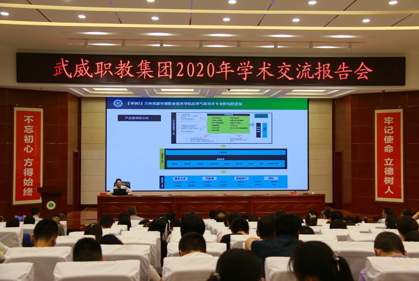 7月11日上午,學(xué)院在大學(xué)生活動(dòng)中心菁英廳舉辦“第35期綠洲講壇暨雙高專業(yè)群建設(shè)專題講座”,邀請(qǐng)到蘭州資源環(huán)境職業(yè)技術(shù)學(xué)院黨委委員、副院長宋元文教授作“基于專業(yè)群發(fā)展的新時(shí)代高職院校建設(shè)”的專題報(bào)告。學(xué)院黨委書記、院長趙明主持報(bào)告會(huì),黨委副書記翟存祥,黨委委員、副院長田迎春、何毅、張開禮、王守云,武威職教集團(tuán)成員單位代表,學(xué)院各部門和教學(xué)院系負(fù)責(zé)人、專業(yè)負(fù)責(zé)人和教師代表共計(jì)200余人參加了報(bào)告會(huì)。
