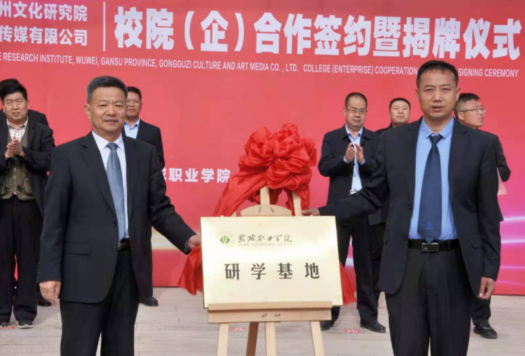 學(xué)院黨委書(shū)記、院長(zhǎng)趙明,武威市涼州文化研究院黨組書(shū)記、院長(zhǎng)張國(guó)才,國(guó)家級(jí)非遺涼州攻鼓子傳承人楊門元參加儀式并致辭,并為“武威市涼州文化研究院文化研究基地”“涼州攻鼓子人才培養(yǎng)基地”“武威職業(yè)學(xué)院研學(xué)基地”揭牌。