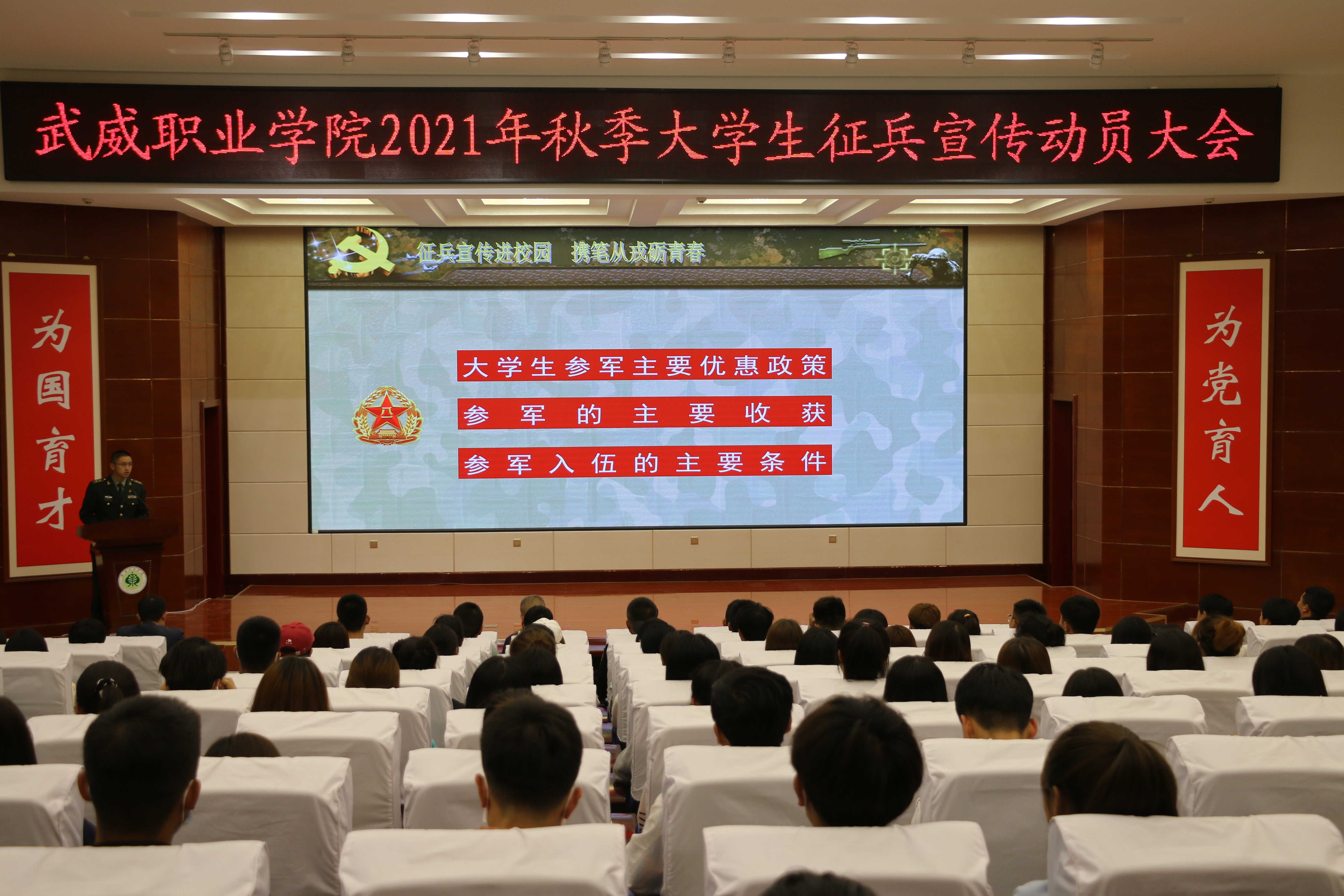征兵宣傳動員大會上,同學們觀看了甘肅省和武威市征兵宣傳片,何志強圍繞征兵優(yōu)撫政策和應征報名條件、程序進行了宣講,全方位、多角度向同學們詳細介紹了2021年大學生征兵的入伍流程、應征條件、選用培養(yǎng)、優(yōu)惠政策等。