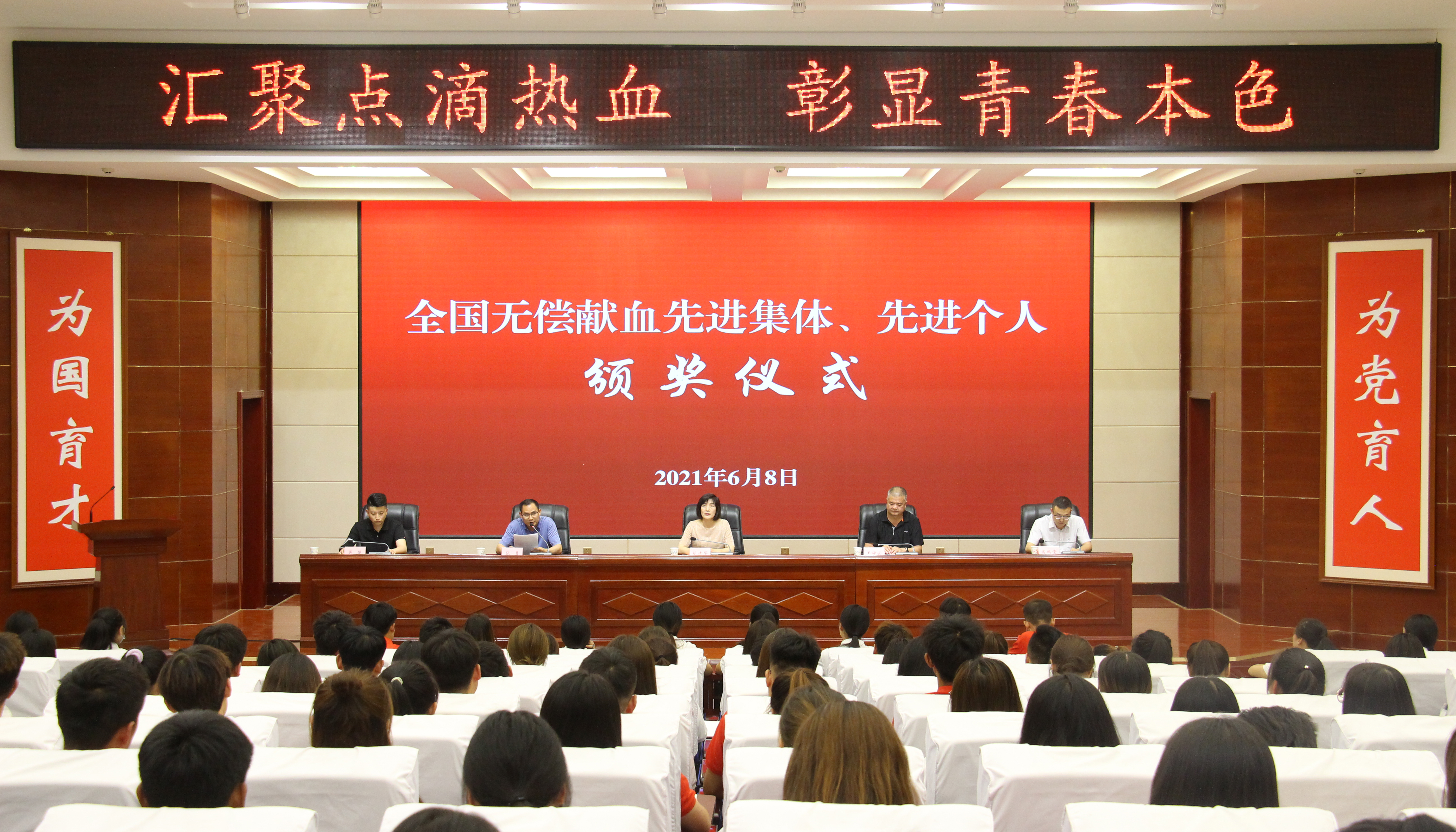 6月8日下午,武威市中心血站、武威市紅十字會在學院菁英廳召開全國無償獻血先進集體、先進個人頒獎儀式。武威市中心血站站長蔡清華,武威市紅十字會專職副會長張勇,學院黨委委員、副院長王守云出席頒獎儀式,學院獻血志愿者代表220人參加活動。儀式由學生工作處、院團委負責人高鵬堂主持。