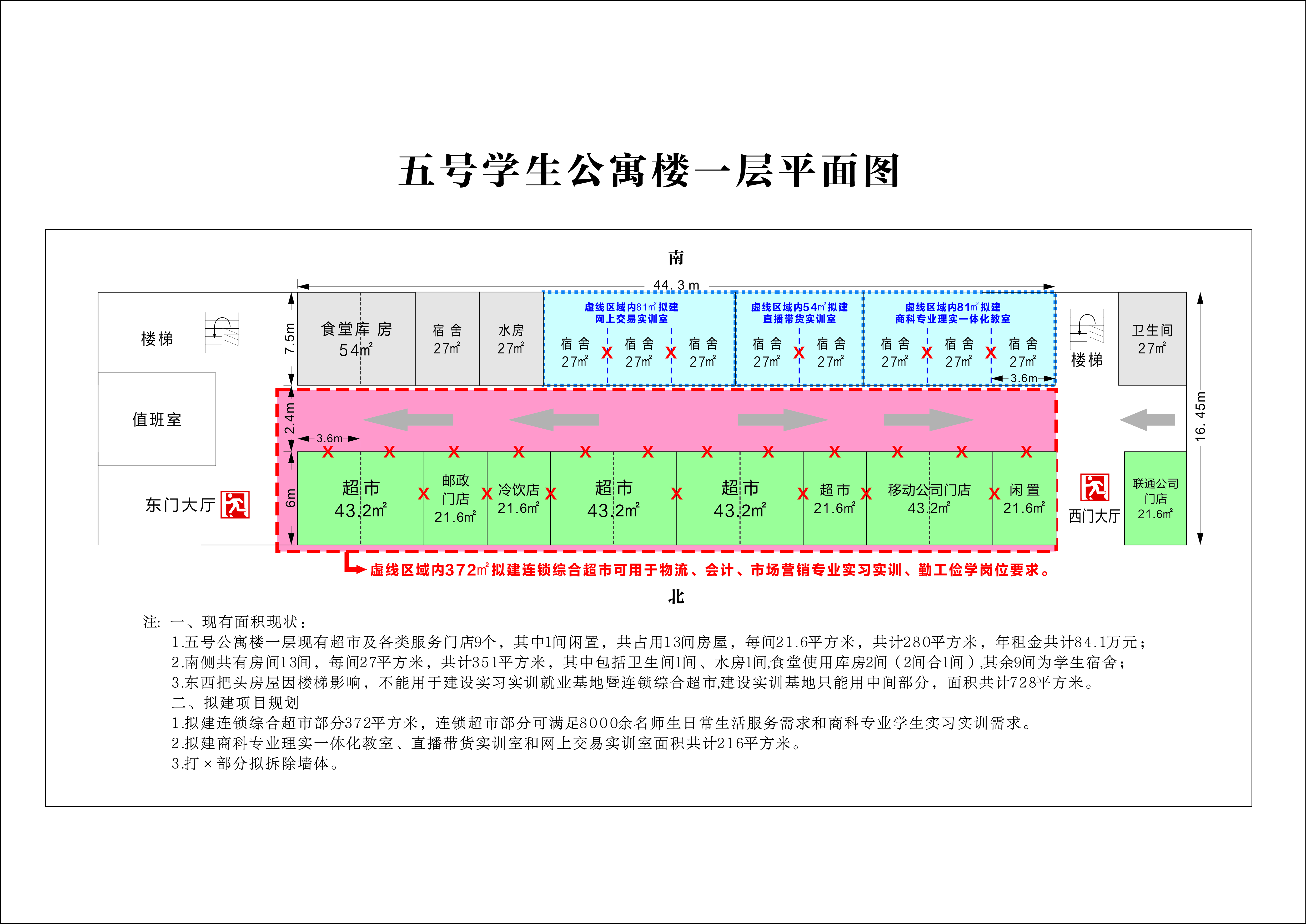 4.學(xué)院提供五號(hào)學(xué)生公寓樓一層面積共計(jì)728平方米場(chǎng)地用于建設(shè)學(xué)院商科專業(yè)所需產(chǎn)教融合實(shí)習(xí)實(shí)訓(xùn)就業(yè)基地暨連鎖綜合超市,其中,216平方米用于建設(shè)商科專業(yè)理實(shí)一體化教室、直播帶貨實(shí)訓(xùn)室和網(wǎng)上交易實(shí)訓(xùn)室;372平方米(原商鋪面積為259平方米,增加113平方米為樓道走廊)用于建設(shè)連鎖綜合超市及實(shí)訓(xùn)場(chǎng)所,滿足師生日常生活需求和商科專業(yè)學(xué)生頂崗實(shí)習(xí)、實(shí)訓(xùn)、勤工儉學(xué)等(改建方案詳見附后平面圖)。建設(shè)所需手續(xù)由學(xué)院和企業(yè)雙方配合完成辦理。