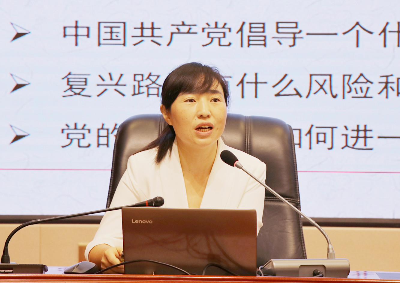 讀書班邀請市委黨史宣傳團(tuán)成員、甘肅畜牧工程職業(yè)技術(shù)學(xué)院副教授羅海燕同志作專題輔導(dǎo)報(bào)告。羅海燕同志從深刻把握習(xí)近平總書記“七一”重要講話的重大意義、深刻把握習(xí)近平總書記“七一”重要講話的豐富內(nèi)涵、學(xué)習(xí)貫徹落實(shí)“七一”講話精神三個(gè)方面,對習(xí)近平總書記在慶祝中國共產(chǎn)黨成立100周年大會上的重要講話進(jìn)行了解讀,報(bào)告主題鮮明、內(nèi)涵豐富,給參加讀書班的黨員干部和師生作了一場精彩的專題輔導(dǎo)。